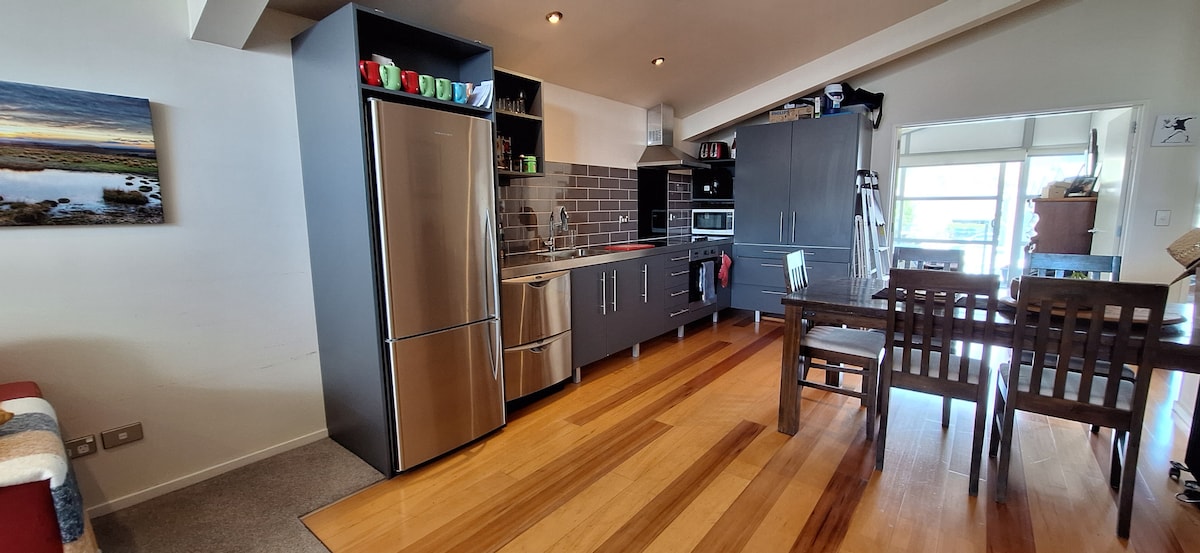 Upstairs apartment in central location. 1 king & 1 queen bedroom. Large open plan living lounge area modern fully decked out kitchen. 1 Bathroom with spa bath and laundry. Desk for working at and large table for meetings or dining. It has everything you need and you can walk to octagon...see other things to note re parking. This is a luxury stay with tons of appeal. Clean & tidy & sheets are by laundry service so always fresh. Not all Airbnb’s are equal and my reviews let you know everything.