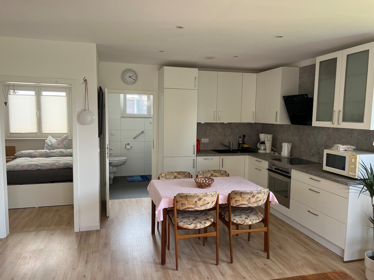 Didelė uždara svetainė (1 kambarys su vonios kambariu) atskirame name pirmame aukšte, su vonios kambariu, virtuvės zona ir didele terasa. Butas turi atskirą įėjimą ir yra apie 60 m ² dydžio. Į būstą patenkama per gražų sodą. Namas yra ramioje šoninėje gatvėje. Automobilį paprastai galima pasistatyti gatvėje. Susidarius ekstremaliai situacijai kaimyninėje gatvėje su trumpu pasivaikščiojimu.