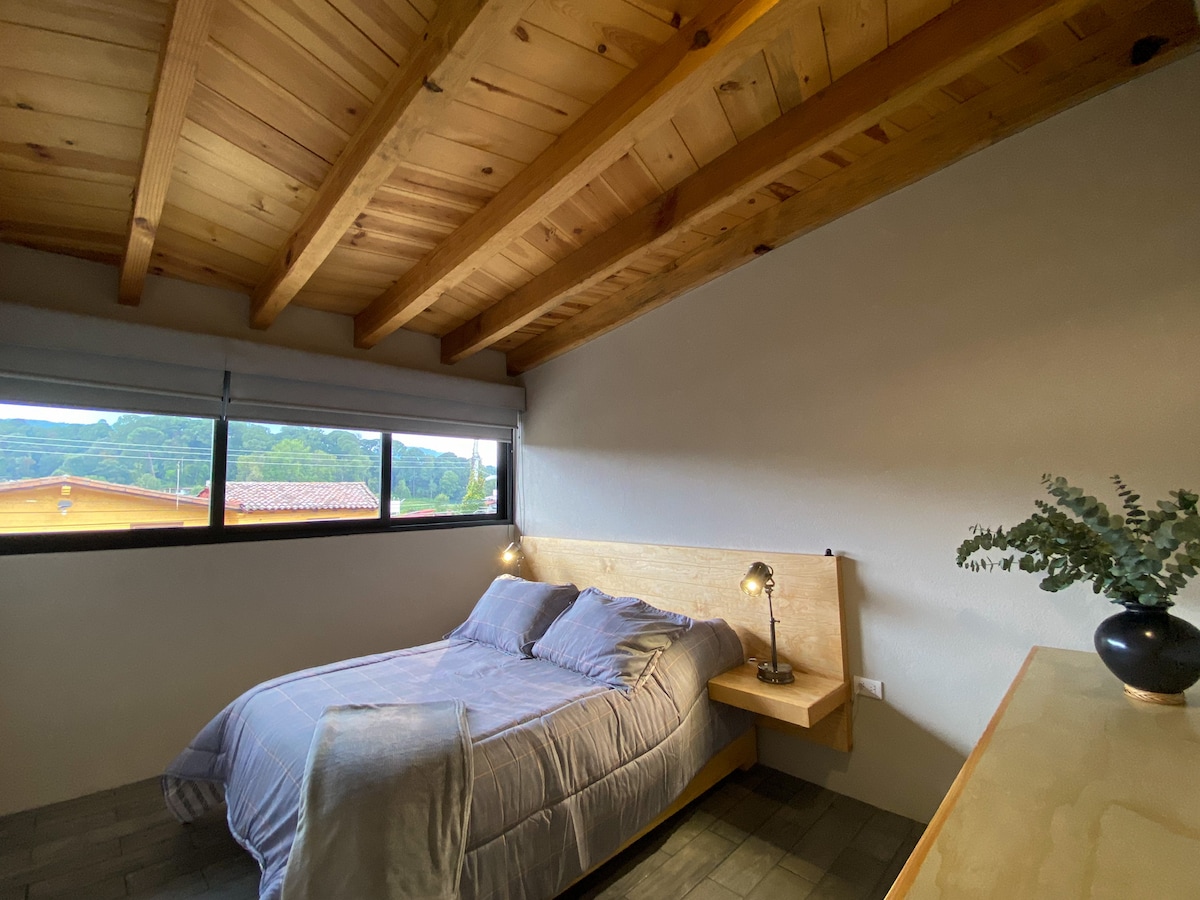 Mes įsikūrę pačioje Valle de Bravo širdyje, už dviejų minučių kelio nuo Centrinio sodo, Alamedos ir prieplaukos. Privatus butas, labai centrinis, su gerais vaizdais iš mūsų ramaus stogo. Idealiai tinka susipažinti su mūsų stebuklingo kaimo žavesiu, nes lengva būti gerai sujungtam su visais patogumais.
