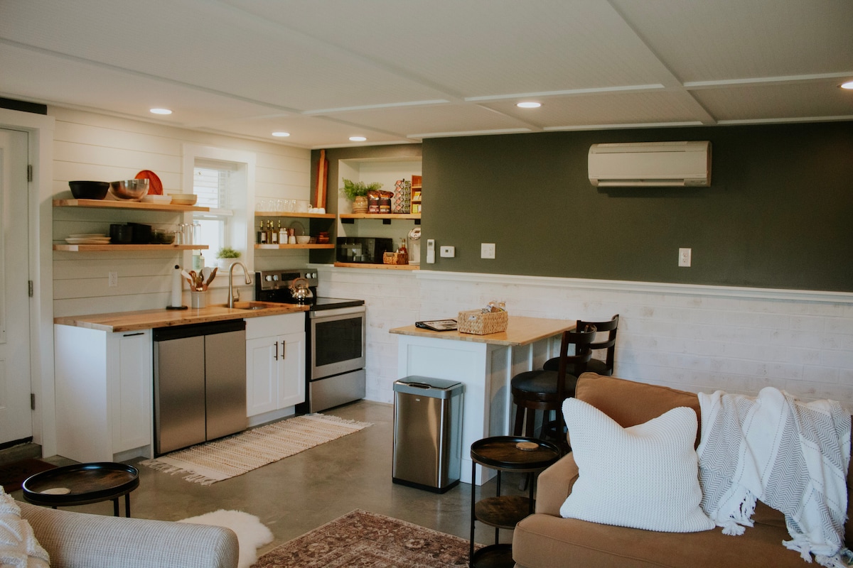 Jaukūs svečių apartamentai, jungiami su pagrindiniu nameliu rąstinėje trobelėje. Pilnai įrengta virtuvė, valgomojo zona, malkomis kūrenama krosnelė, patogi dvigulė lova, drabužinė, žaidimai, 100 filmų. Įėjimas į dušą ir įmontuota sėdynė. Skalbykla su durimis į denio zoną, bistro stalai, laužavietė. Skliautinėje svetainėje yra ištraukiama meilės kėdė vienam miegui, televizorius [ROKU, You Tube TV, HULU, Netflix, Amazon, Disney], „Blu-Ray“ grotuvas ir „Google Nest Mini“. Mėgaukitės pusryčiais, pvz., šviežiais kiaušiniais, sultimis, pienu, duona, kava, arbata ir mūsų namine pica.