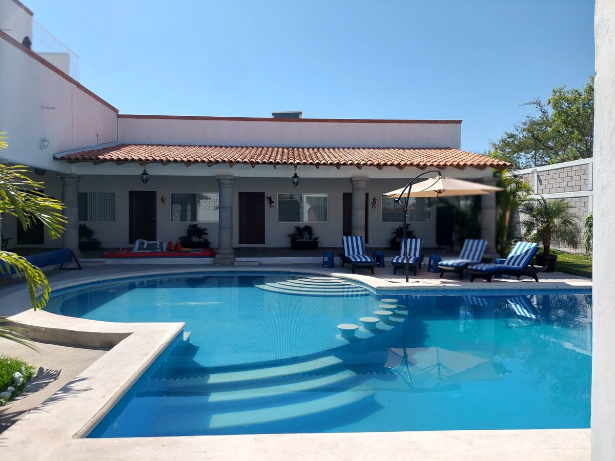 Gražus Viduržemio jūros stiliaus namas, paslėptas Morelos, Emiliano Zapata savivaldybėje, labai arti Hacienda de Chiconcuac ir El Cid sodo. WIFI. Stucco uždengtos sienos papildomam gaivumui užtikrinti, aukštos dvigulės vandens lubos su gražiomis sijomis, kurios suteikia Viduržemio jūros pojūtį. Jame yra 2 erdvūs miegamieji su balkonu, 3 pilni SPA vonios kambariai, pilnai įrengta virtuvė, gražus privatus sodas ir didžiulis baseinas bendroje erdvėje. ATEIKITE IR MĖGAUKITĖS