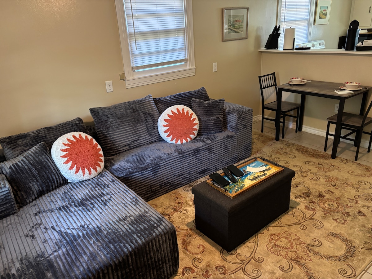 Private entrance, only shared space is adjoining backyard. Queen mattress, Keurig, mini fridge, microwave, sanitized jetted tub, spa foot massager & so much more. Gate from driveway leading to your door with keyless entry. Area is very quiet. The backyard is the ONLY shared area. Couch is extremely comfortable to sleep on & I can reconfigure room to add double air mattress on request.