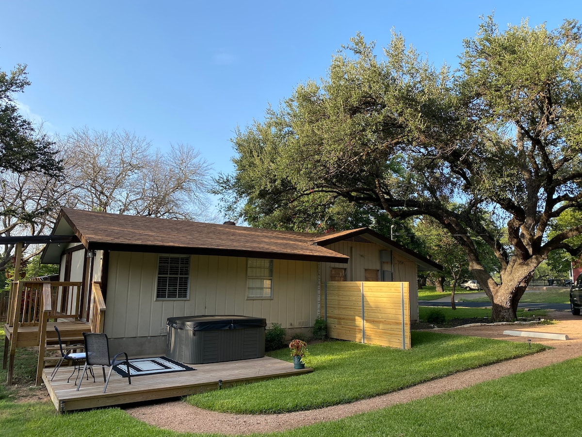 Pabėkite nuo miesto ir atsipalaiduokite! Creekside Suite yra visas pirmasis mūsų namų aukštas - gyvenamosios erdvės nėra bendros. Mėgaukitės Hill Country malonumais šiame 2 akrų poilsiavietėje netoli Kanjono ežero. Apartamentuose gali apsistoti iki 4 svečių su karališko dydžio lova miegamajame, karališko dydžio miegamąja sofa svetainėje ir visa virtuve. Mėgaukitės pramogomis dideliame pagrindiniame denyje arba pamatykite ežerą iš antro aukšto šoninio denio. Atsipalaiduokite trečiame privačiame denyje su sūkurine vonia ir lauko dušu.