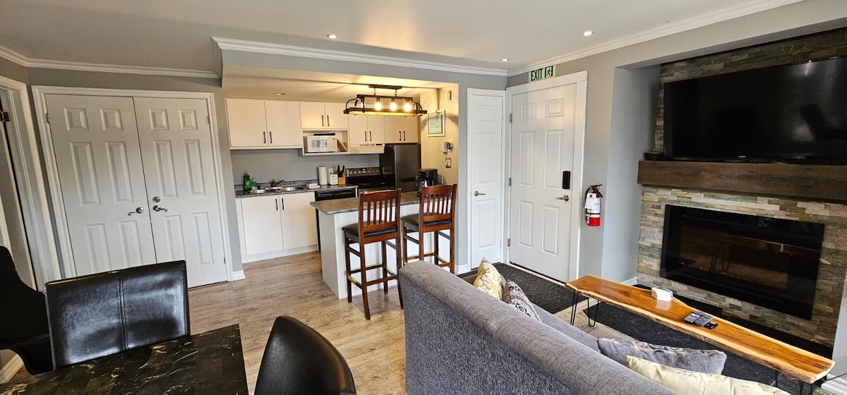 Butas yra prie Living Stone Golf Resort, už kelių minučių kelio nuo Kolingvudo centro ir už 10 minučių nuo Blue Mountain/Scandinave Spa. Mūsų renovuotas kondominiumas pasižymi modernia elegancija. Mėgaukitės 625 kv. pėdų privatumu su dviem miegamaisiais ir vienu vonios kambariu su vonia ir dušu. Taip pat yra sofa, elektrinis židinys, Netflix ir pagrindinis kabelis, WI-FI, skalbyklė-džiovyklė. Lauko terasa su vaizdu į sodą.