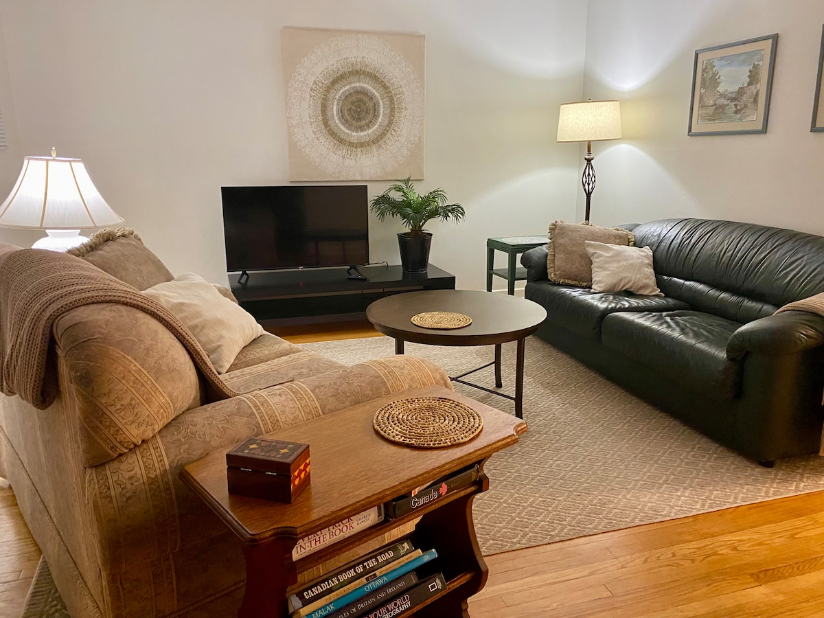 Šis naujai renovuotas 2 miegamųjų apartamentų butas, esantis ramioje, bet centre esančioje gatvėje, yra vos už kelių žingsnių nuo kanalo, restoranų, kavinių, autobusų/metro ir visų pramogų, kurias gali pasiūlyti Kanados sostinė. Pastatykite automobilį mūsų privačiame įvažiavime ir važiuokite dviračiu arba pasivaikščiokite (arba žiemą čiuožkite!) bukoliškais paupiais takais į miesto širdį. Vasarą mėgaukitės rytine ekologiška kava klausydamiesi paukščių ant kiemo terasos. Žiemą jauku priešais dujinį židinį.
