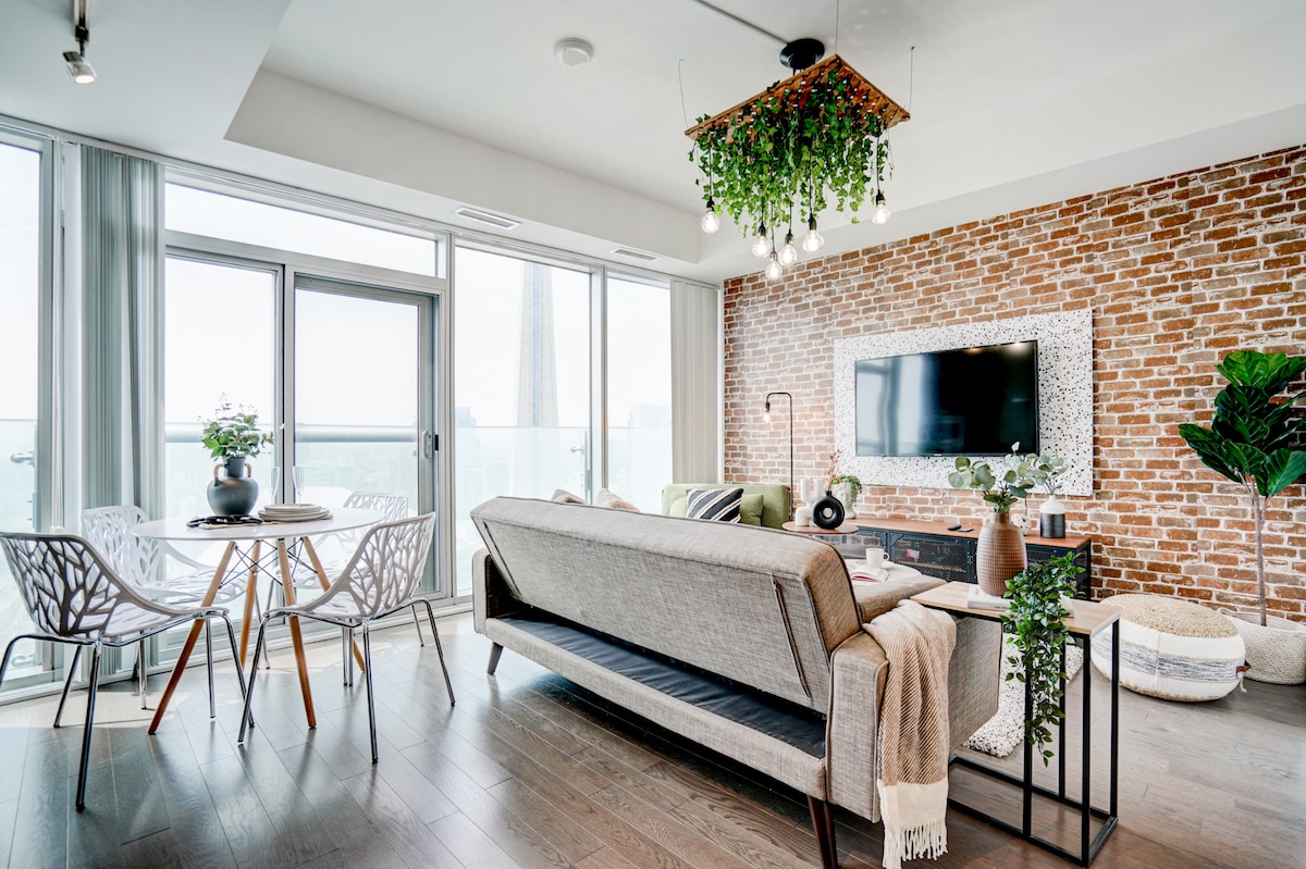 Jaukus 2 miegamieji + 2 pilnos vonios butas miesto centre; neužstotas vaizdas į CN bokštą; 1 nemokama automobilių stovėjimo aikštelė. Puikiai tinka verslo ar atostogų viešnagei! ATSTUMAS PĖSČIOMIS IKI: • Prekybos centras ir LCBO prekybos centras: 1 min. • Scotiabank arena: 3 min. • Union Station: 3 min. • Konferencijų centras: 3 min. • Riplio akvariumas: 3 min. • UPX traukinys: 5 min. • Harborfas: 5 min. • CN bokštas: 5 min. • Rodžerso centras: 7 min. • Roy Thompson salė: 9 min. • Karališkasis Aleksandro teatras: 12 min. • Šv. Lorenso turgus: 18 min.