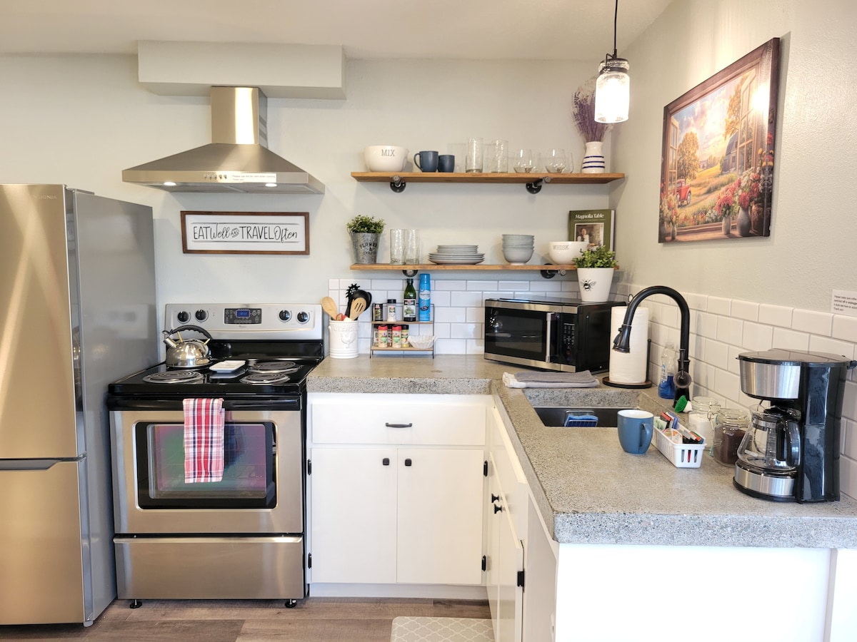 Unwind at The Honeysuckle Suite, a peaceful and cozy countryside gem. ☞ Plush queen bed with blackout curtains ☞ Reclining sofa ✭“The space was super clean, inviting, and stocked” ☞ Onsite washer + dryer ☞ Fully equipped + stocked kitchen ☞ A large tiled double-head shower ☞ Lg truck parking If you’re here to work, explore, or simply recharge, this hidden gem offers the comfort you’re looking for. Book your stay today and enjoy the calm of country living!