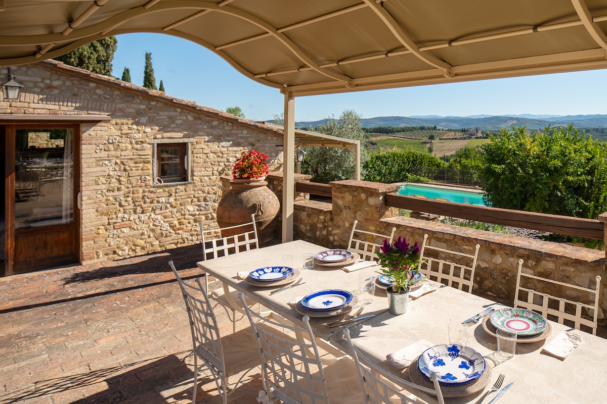 Praleiskite atostogas Toskanos kaimo širdyje, šiame jaukiame akmeniniame name su terakotos grindimis ir sijotomis lubomis iš kieto ąžuolo, kuriame yra autoriaus paveikslai, su visais patogumais. Mėgaukitės maudydamiesi dideliame bekraščiame baseine (18 m x 9 m, atidarytas tik nuo gegužės 1 d. iki spalio 15 d. Akmeninio namo svečiams) arba atsipalaiduokite fotelyje po lodžija, ragaudami taurę Chianti vyno priešais vynuogynų, alyvų giraites, miškus ir viduramžių kaimų kalvas.