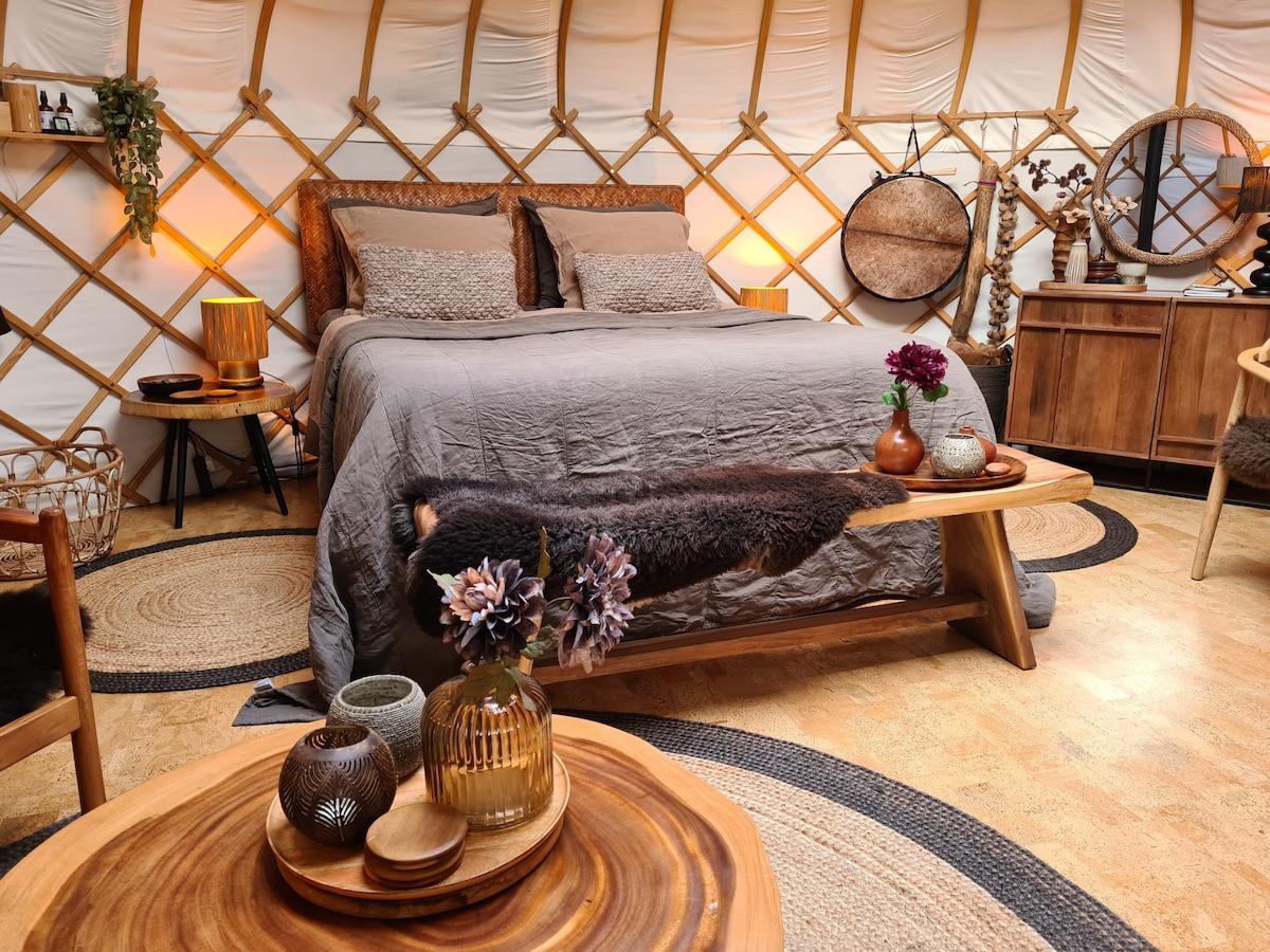 This yurt is a magical place where you feel nature and embrace life around you. Enjoy the sun, moon and stars, the smell of rain and the rustling of the wind. Inside it is warm and cozy, outside the landscape stretches endlessly. No hustle and bustle, only peace, space and each other. A stylish retreat, with comfort and a touch of luxury and a large terrace outside. The ultimate glamping experience, in summer and winter, for a romantic stay for two.