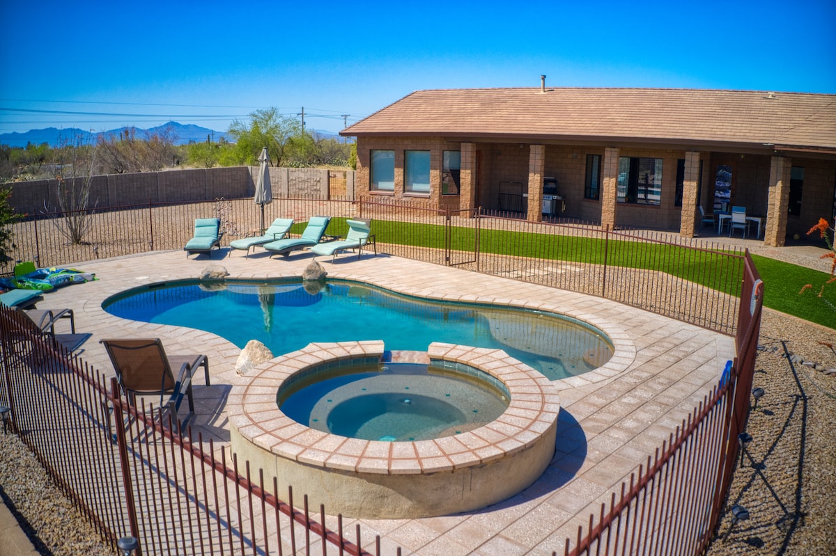 Tai jūsų namai toli nuo namų! Nuostabus poilsis su privačiu baseinu, sūkurine vonia, elektromobilio įkrovimu, namų biuru ir vešliu kiemu! Šiuose patraukliuose namuose, neseniai renovuotuose su 40 tūkst. $ atnaujinimais, yra atviras išplanavimas ir virėjo virtuvė, puikiai tinkanti susibūrimams. Mažiau nei mylia nuo Arizonos paviljonų ir trumpa kelionė iki Tucson Premium Outlets, UA, I-10 ir miesto centro. Netoliese golfo aikštynas, pėsčiųjų takai, parkas su kiemais, biblioteka, purslų kilimėlis ir Saguaro nacionalinis parkas! Atsipalaiduokite dykumos grožyje!