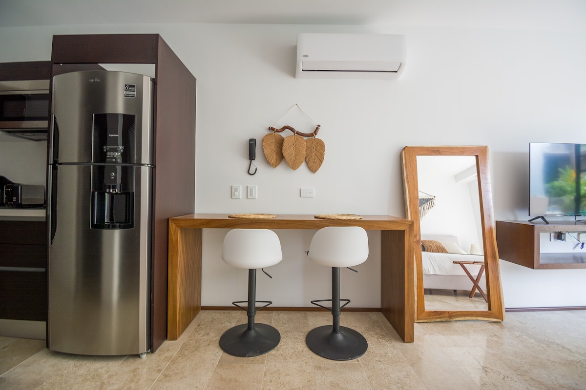 3 min. pėsčiomis iki Centro Tulum 5 min. kelio automobiliu iki Tulumo paplūdimio 5 min. kelio automobiliu iki Tulumo griuvėsių Apsistoję šioje gražiai suprojektuotoje, modernioje studijoje, esančioje netoli Centro Tulum, viduje ir lauke sklandžiai dera gyvenimas patalpose ir lauke. Šiuolaikinis su šviesolaidiniu belaidžiu internetu ir atviru miegamuoju, elegantiška modernia virtuve, erdviomis gyvenamosiomis erdvėmis ir prabangiais baseinais - šis ramus poilsis taip pat yra vos už kelių minučių kelio nuo geriausių restoranų ir barų. Balkonas yra šalia ramaus krioklio. Patirkite Tulumą su mumis ir sužinokite daugiau žemiau!