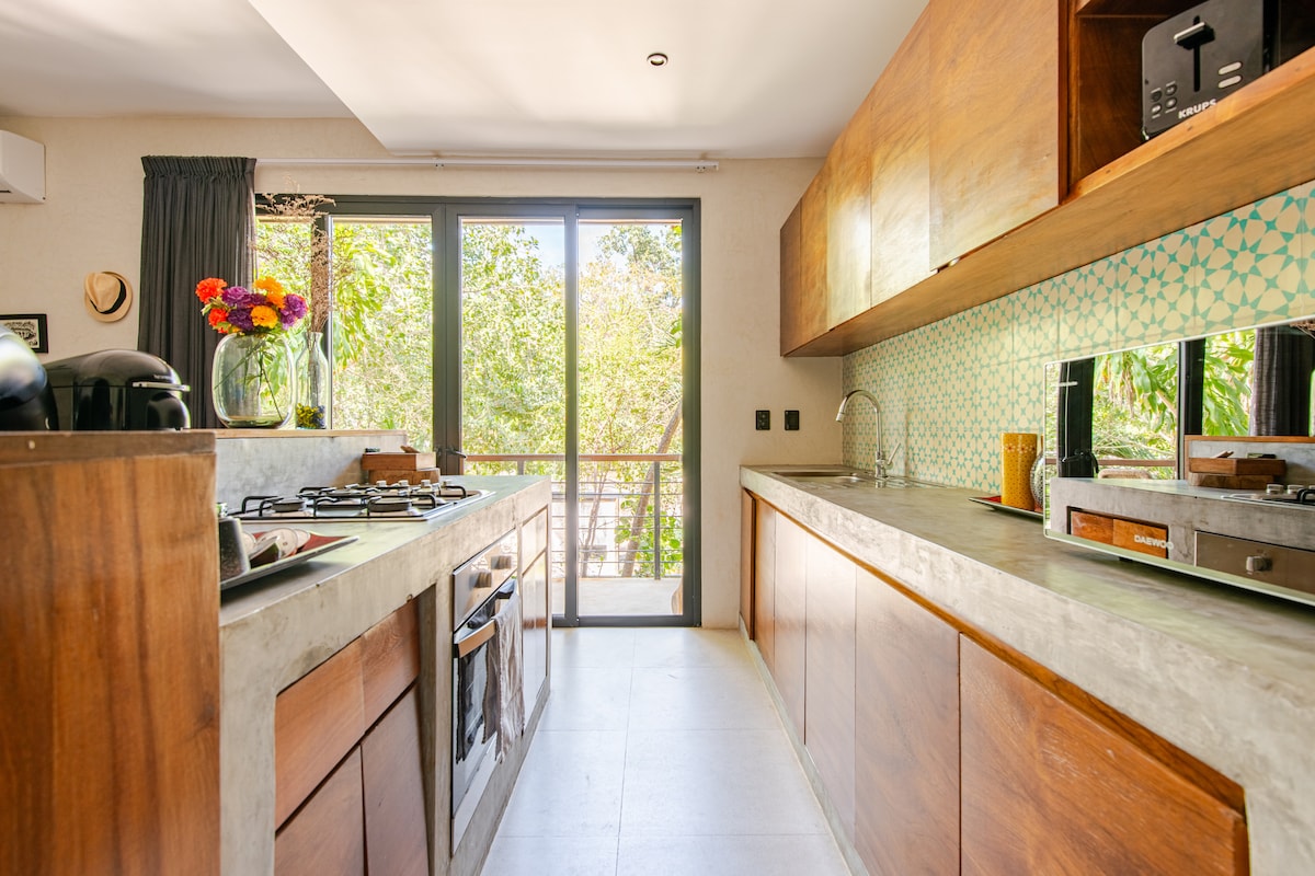 Jungle Oasis Loft su privačiu baseinu ir terasa! Pabėkite į šį stilingą 2-ame aukšte esantį loftą su privačia terasa ir baseinu, iš kurio atsiveria vešlūs džiunglių vaizdai! Viešnagės metu mėgaukitės nemokamais dviračiais, pilnai įrengta virtuvėle ir visą parą veikiančiu saugumu, kad būtumėte ramūs. Ši moderni poilsiavietė, sukurta poroms, pavieniams keliautojams ir skaitmeniniams klajokliams, yra jauki,rami ir apsupta gamtos vos už 15 min. kelio nuo paplūdimio ir miesto centro! Atsipalaiduokite karališko dydžio lovoje, pasinerkite į baseiną arba tyrinėkite netoliese esančias cenotes,paplūdimius ir dar daugiau!