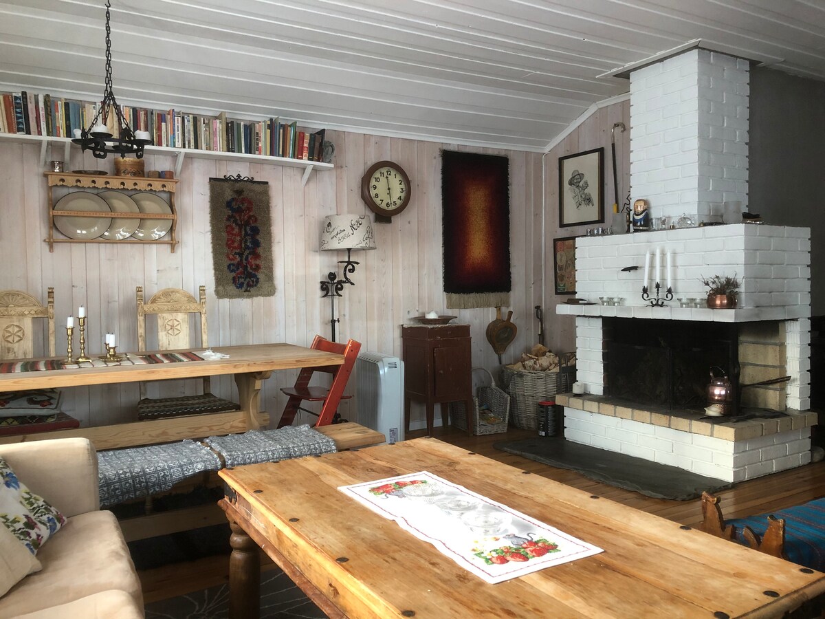 Jaukus, senesnis kotedžas dideliame aptvertame sklype kartu su priedu, Stabbur ir dirbtuvėmis su studija. Vaizdas žudyti už... Atnaujinta nuo 2015 m., bet vis dar jauku, išsaugota daug originalių grindų ir paviršių. Virtuvė visai šeimai ir svečiams (+12pax) Wi-Fi 150/150 mbs, AppleTv Papildoma erdvė nuomai: * Stabbur <40m2, apstatyta nauju senu stiliumi * Atskira studija/ papildomas kambarys su dvigule lova. Pastaba! Nuomos kaina pakoreguota pagal dideles elektros kainas.