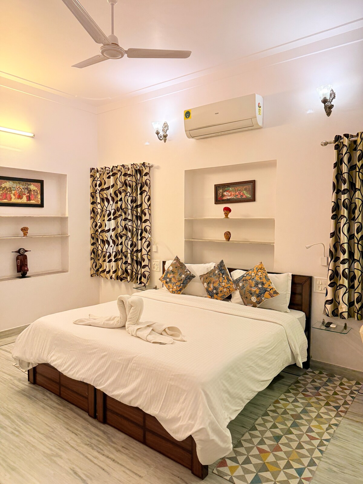 Sveiki atvykę į šį žavingą 2BHK butą, esantį Udaipūro širdyje, mieste, garsėjančiame turtingu kultūros paveldu ir ramiais kraštovaizdžiais. Šiuose butuose puikiai dera šiuolaikiniai patogumai ir tradicinė elegancija, suteikianti jums patogią ir patrauklią gyvenamąją erdvę. Įsikūrę į butą iš karto pastebėsite jaukią atmosferą, kuri jus apgaubia. Šilti, žemiški interjero tonai sukuria ramybės atmosferą, todėl jaučiatės kaip namie.