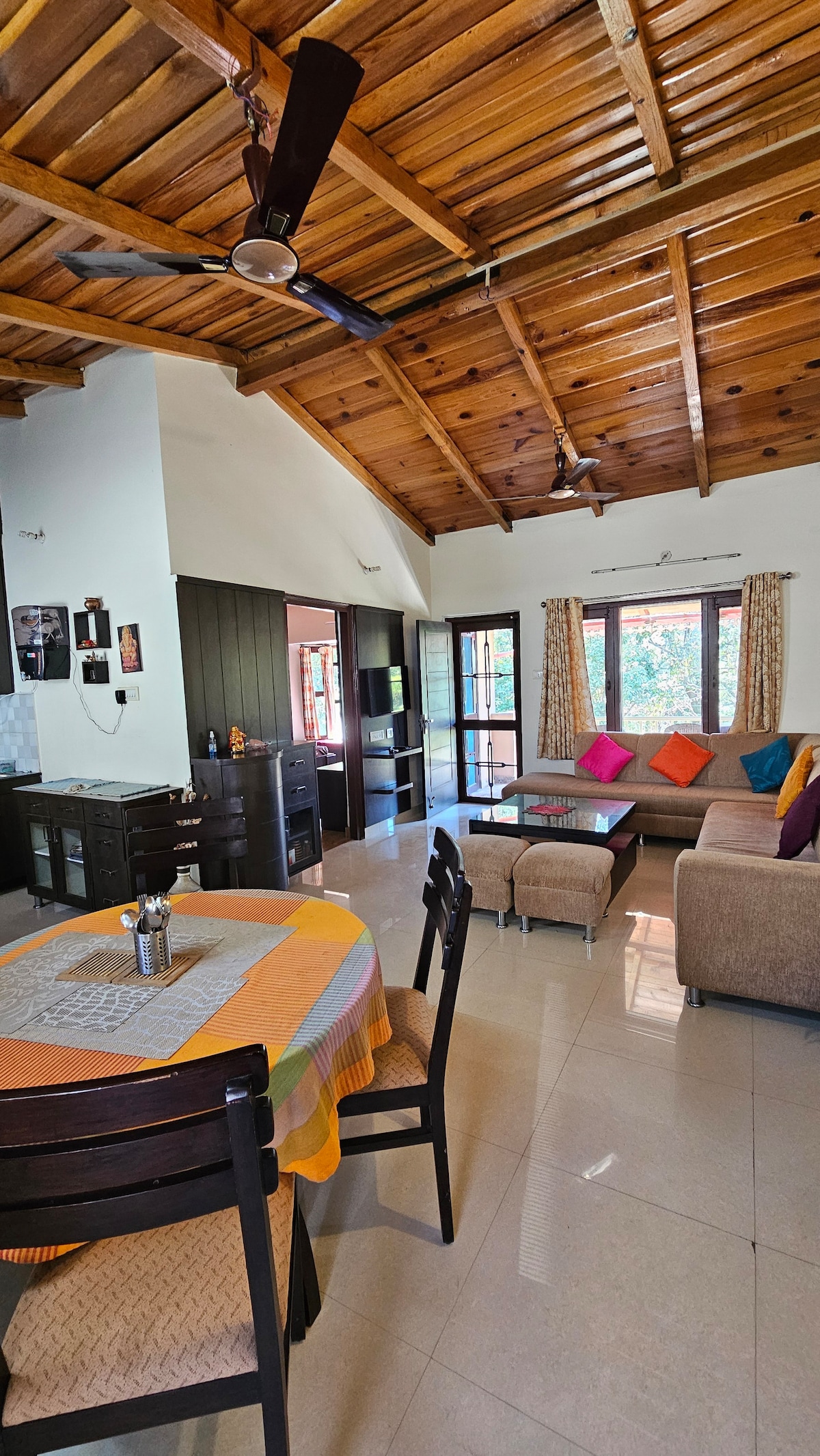 Escape to this beautifully designed, spacious apartment nestled in the hills, offering a perfect blend of comfort and nature. With soaring wooden ceilings, large windows & stunning views of the surrounding lake & forest, this serene space is ideal for couples, families, or remote workers. Step outside for a stroll to the lakeside in the vicinity or simply unwind indoors with fast Wi-Fi and modern comforts. Surrounded by greenery and calm, this is a perfect spot to relax, reflect, or recharge.