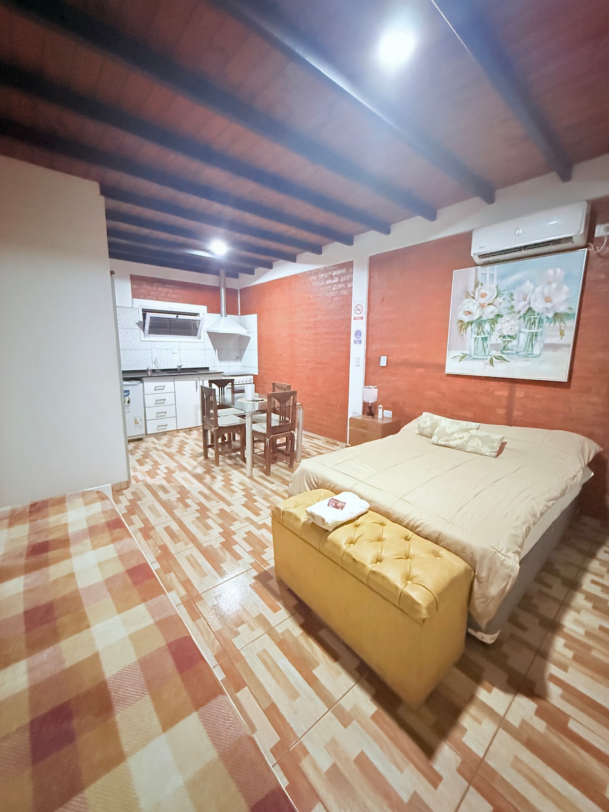 Pirmo aukšto butas, vienas miegamasis, vonios kambarys su bidė, virtuvė-valgomasis, po prekystaliu, spinta, elektrinis rezervuaro vandens šildytuvas, mikrobangų krosnelė, elektrinė orkaitė ir virdulys, viryklės, indai, skalbimo mašina, šaldytuvas. Wi-Fi internetas, karšto ir šalto oro kondicionierius dviejuose kambariuose. Apsaugos kameros, garažas, automatiniai stumdomi vartai, 2 medinės dviaukštės lovos, sofa, paklodės, rankšluosčiai, kepsninė. Išmanioji televizija 43colių, lygintuvas, plaukų džiovintuvas. 20 min. kelio nuo Villicum trasos. 5 minutės nuo Costanera būsto. Autobusų stotelė prie įėjimo