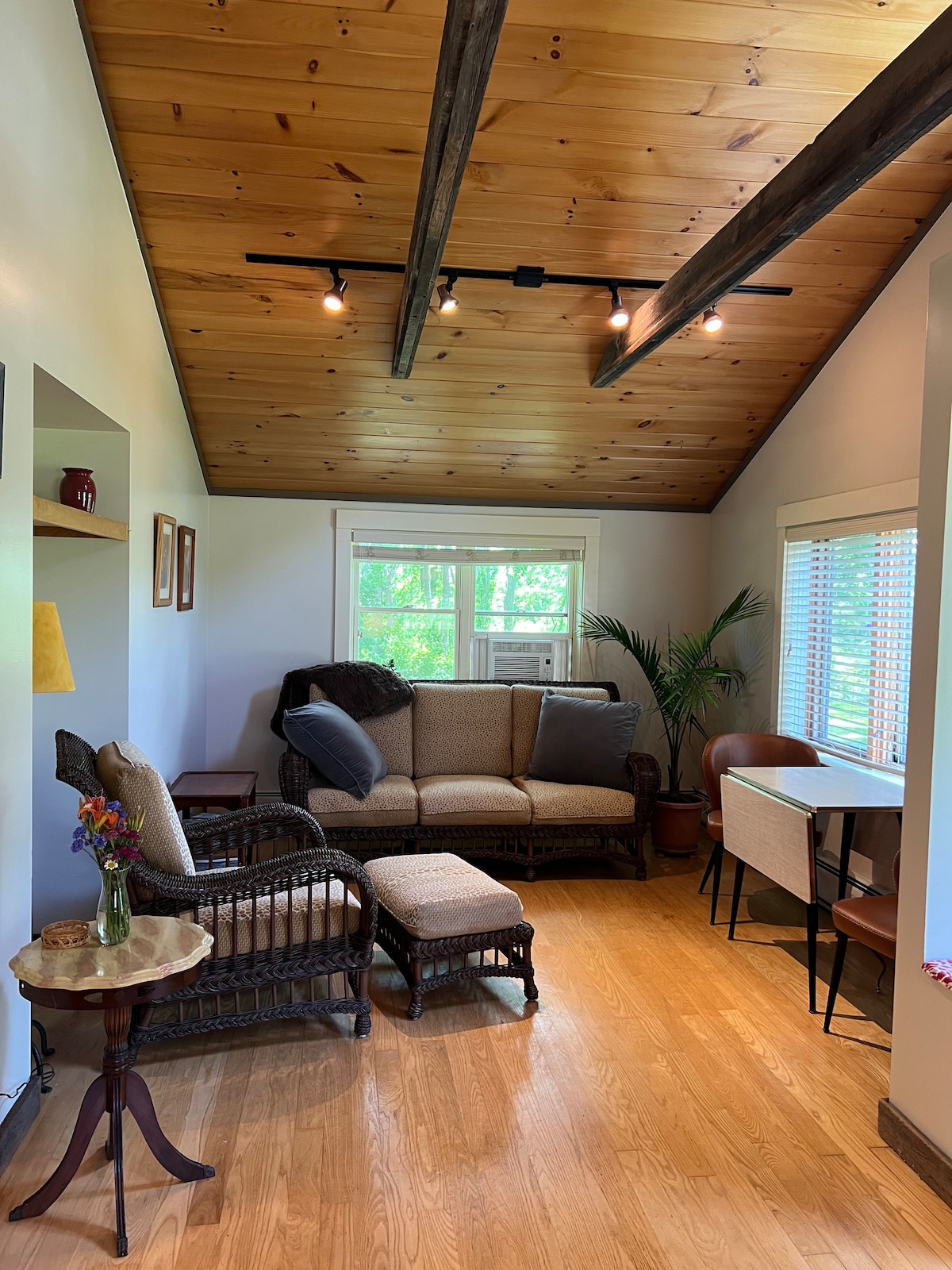 Sweet cottage with vaulted ceiling, lots of natural light and a full kitchen. Private bedroom with queen bed sleeps two. Beautiful and quiet outdoor setting with wonderful large yard with lots of trees. Great location for a visit to Ithaca and Trumansburg. Close by are wineries, Cornell University, Ithaca College, 4 state parks, Cayuga lake, trails, gorges and waterfalls. Wake up surrounded by trees on this beautiful property. NO tv or wifi for a relaxing and peaceful stay.