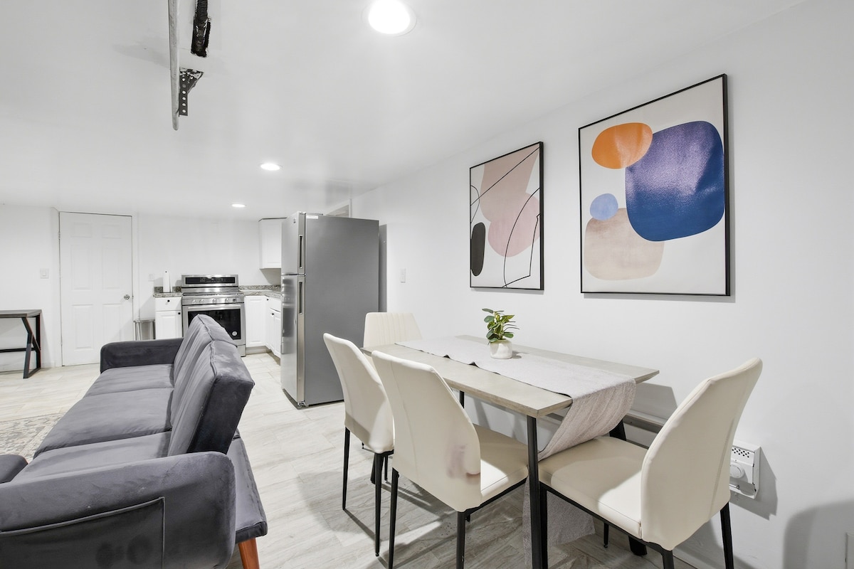 Vos už 10 minučių kelio nuo EWR ir Niuarko „Penn“ stoties. Šis privatus apatiniame aukšte įrengtas liukso tipo numeris yra rami poilsio vieta specialistams ir keliautojams. Erdviame miegamajame yra 2 plačios dvigulės lovos ir privatus vonios kambarys. Mėgaukitės atskira svetaine, pilnai įrengta virtuve su virtuvės reikmenimis ir atskira valgomojo zona, kurioje galėsite mėgautis namuose pagamintais patiekalais. Ženkite į savo privatų kiemą išgerti rytinės kavos arba pasisemti motyvacijos gryname ore. Puikiai tinka medicinos darbuotojams, mokslininkams arba tarpinių nusileidimų metu – idealus privatumo ir praktiškumo derinys.