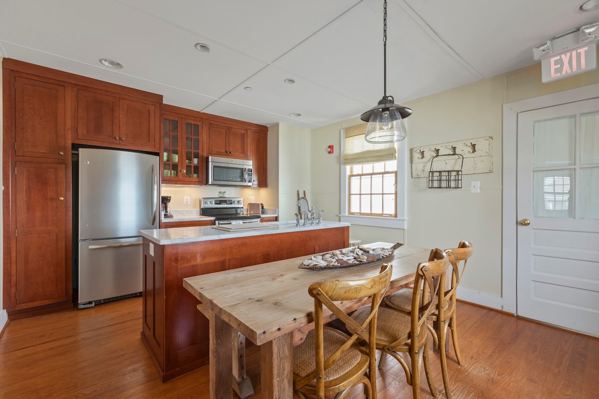 VAIZDAS Į VANDENYNĄ – 100 metrų iki paplūdimio laiptų. Švyturys yra viršutiniame aukšte, niekas nėra po jumis ar šalia. Pagrindinėje nuotraukoje jis yra dešinėje. Romantiška erdvė, didelė studija, elektrinis židinys, kambaryje yra sūkurinė vonia, virtuvė, vonios kambarys, puikus vaizdas į vandenyną. Gali miegoti iki 4 asmenų. Viena karališko dydžio lova, 2 grindų kilimėliai, kurie sudaro karališko dydžio čiužinį. Leidžiama atvykti su augintiniais už 10,00 $ už naktį už augintinį. 9,8 % apgyvendinimo mokestis bus taikomas atskirai po užsakymo. Ideali vieta Midtaune, maždaug už 100 metrų nuo paplūdimio laiptų.