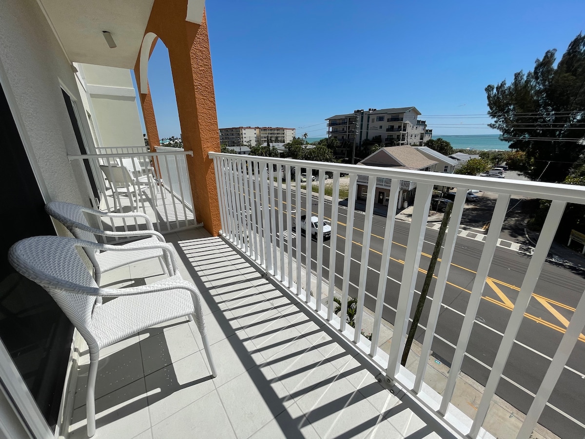 Mėgaukitės palaima šalia paplūdimio šiame stilingame 2BR/2BA Madeiros paplūdimio bute – vos už kelių žingsnių nuo smėlio (kitoje gatvės pusėje) ir už kelių minučių pėsčiomis iki John's Pass! Atsipalaiduokite privačiame balkone su vaizdu į įlanką arba deginkitės prie baseino. Įskaičiuota: galimybė naudotis visais kurorto patogumais, Wi-Fi, automobilių stovėjimo aikštele ir paplūdimio reikmenimis – rankšluosčiais, kėdėmis, skėčiu ir vežimėliu. Liftas į ketvirtą aukštą, kad būtų lengva pasiekti jūsų pakrantės atostogų vietą!
