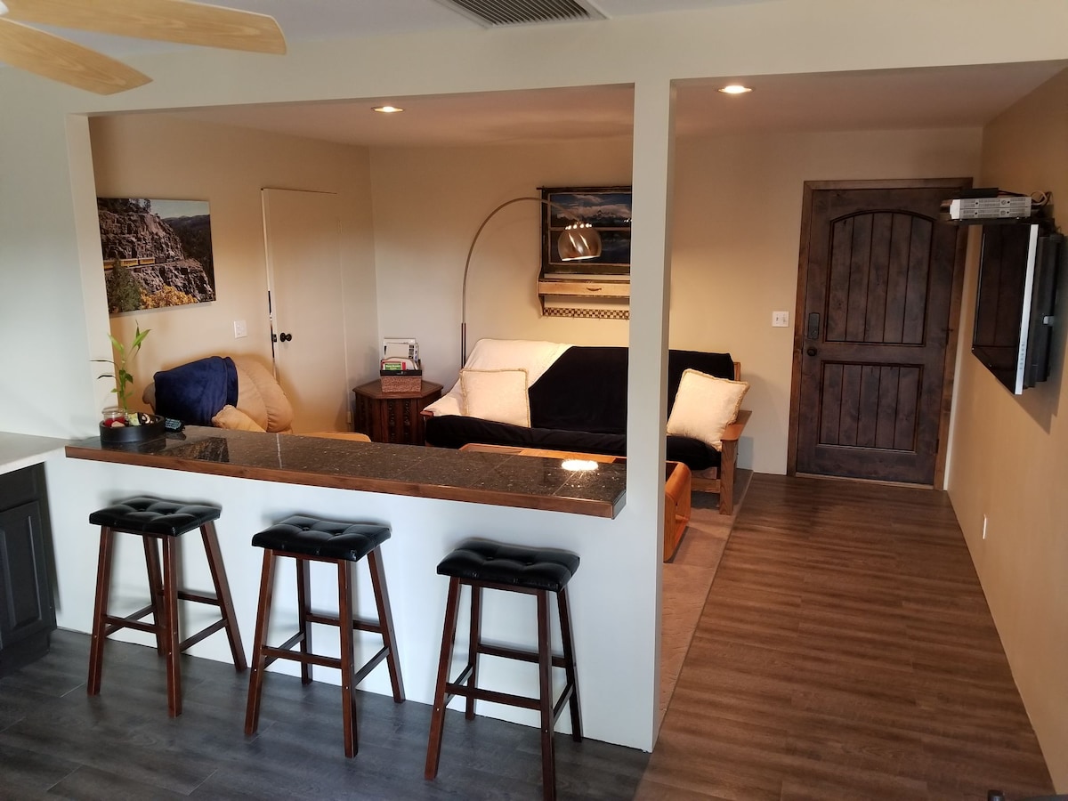 Siūlome pilnai įrengtą 1 miegamąjį su karališko dydžio lova, vonios kambarį, svetainės zoną su televizoriumi, futoną, kuriame galima miegoti 1, pilną virtuvę (be indaplovės). Tai mūsų namo priedas - atskira gyvenamoji erdvė su atskiru įėjimu, L formos galiniu kiemu, oru/šiluma. Įskaičiuotas belaidis internetas. Tonto nacionalinis miškas, Saguaro ežeras, Druskos upės vamzdžiai ir laukiniai arkliai, baidarės, JAUNIKLIŲ parkas, Tempe centras, kazino, Sky Harbor oro uostas, gražūs žygiai Prietarų kalnuose yra už 20 minučių kelio. Ateikite ir mėgaukitės!
