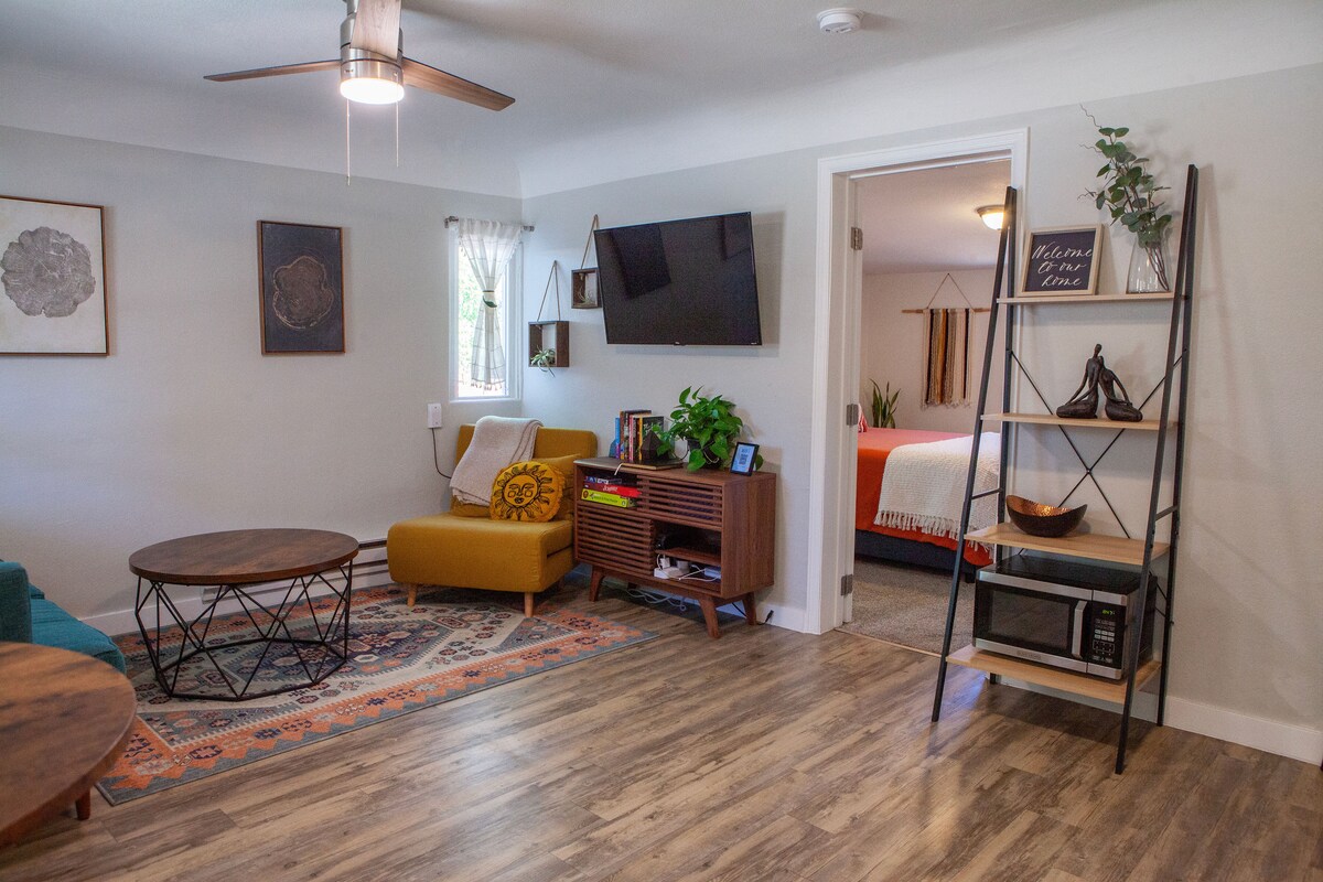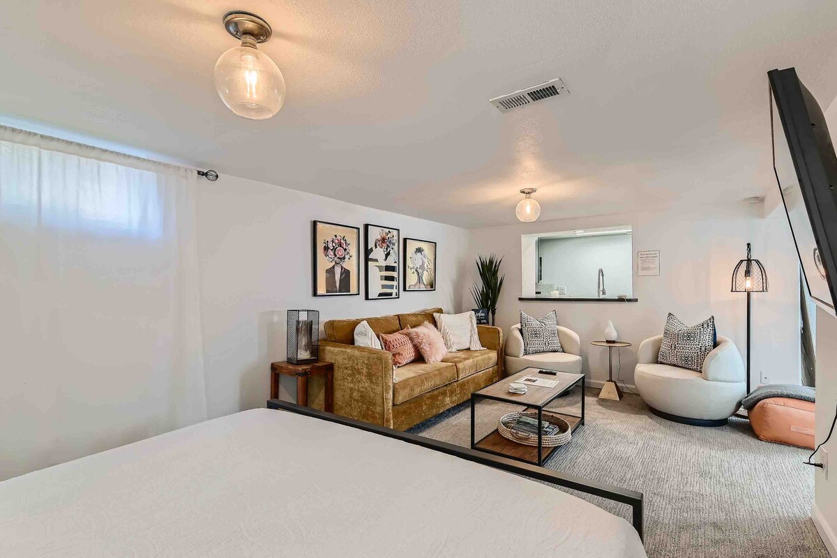 Welcome to your stylish open-studio retreat! This cozy, modern space features a sleek living area, well-equipped kitchenette, and private bed & bath. Just 10 minutes to Downtown, Coors Field, Ball Arena & Empower Field and roughly 30 minutes to/from the airport, with the Rocky Mountains nearby. Quick access to I-70 for ski trips or a 20-minute drive to Red Rocks Amphitheatre. Enjoy the perfect mix of comfort, charm and ultimate convenience for your Denver stay! We can't wait to host you!