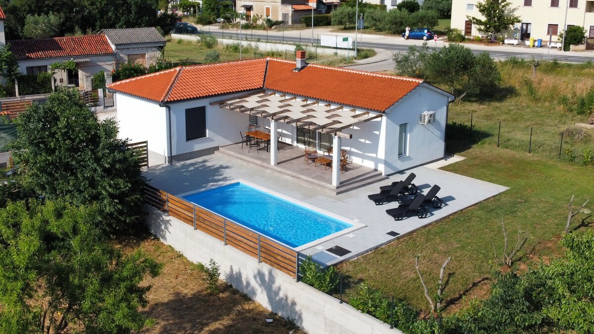 Samostojeća, nova prizemnica 2020-te godine ograđena i okružena zelenilom i maslinama, sa bazenom. Mirno naselje, u blizini park šume ( trim staza, bicikla), blizina centra 3.5 km, besplatan parking ispred samog objekta, besplatno korištenje interneta...Kuca se sastoji od dvije spavaće sobe ( bračni krevet) svaka sa svojim kupatilom, unutarnje i vanjske kuhinje, dnevnog boravka sa kaučem na razvlačenje (bračni krevet), velikom natkrivenom terasom, ostavom sa mašinom za pranje rublja, te mali wc.