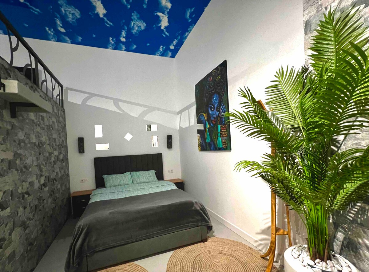Mėgaukitės Ruzafa iš mūsų jaukios, viršutinio aukšto studijos su privačiu vonios kambariu ir virtuve! Paskutiniame aukšte yra liftas, jame yra oro kondicionierius, išmanusis televizorius ir didelės spartos internetas. Mėgaukitės sulankstoma patogia lova/sofa (135x190 cm), stalu ir vakarienės stalu, kad erdvė būtų efektyvi. Virtuvėje yra orkaitė ir mikrobangų krosnelė bei didelė spinta daiktams laikyti. Papildomi patogumai: filtruotas vanduo, tinklelis nuo uodų ir bendra skalbimo mašina. Jūsų tobula Valensijos bazė!