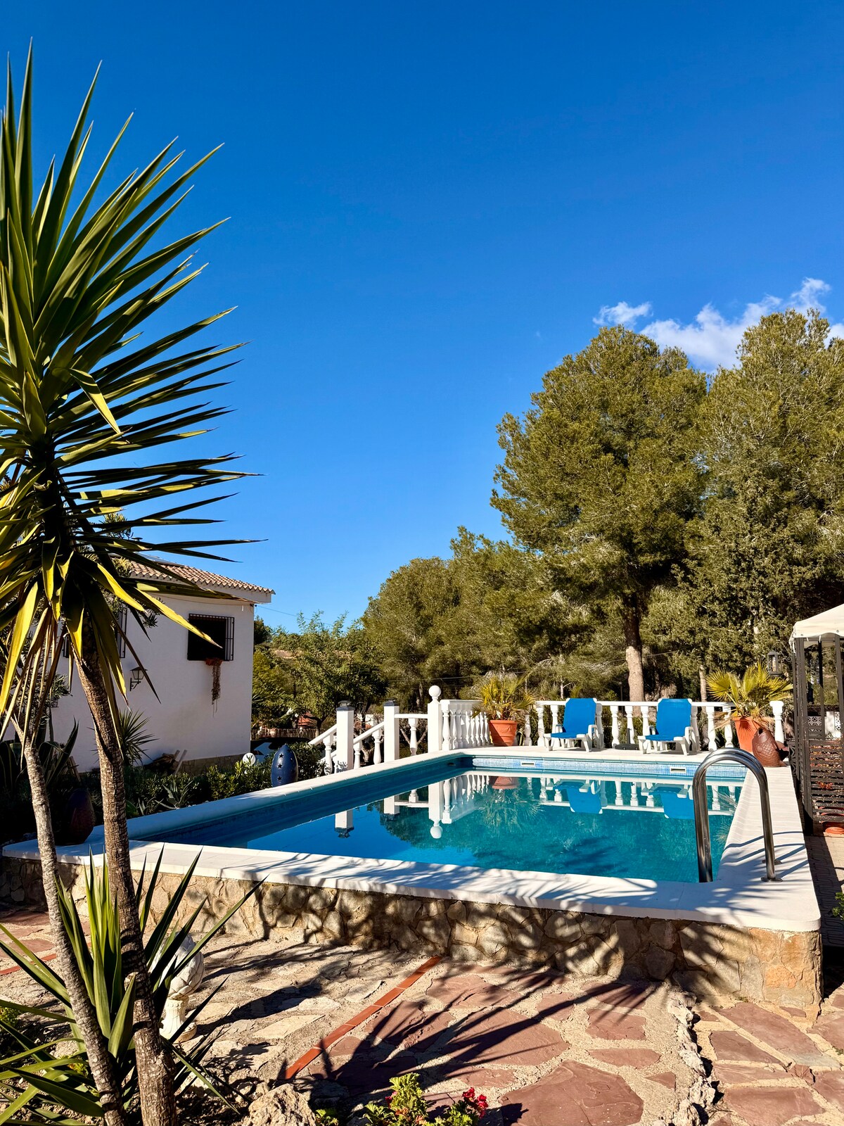 Esame vos už 7 minučių kelio automobiliu nuo Bunol centro, už 30 km nuo Valensijos. Jūs atsidursite ramiame kaime, idealiai tinkančiame žygiams pėsčiomis, važiavimui dviračiu ir paukščių stebėjimui (matome auksines orioles, bičių valgytojus, lankus ir erelius). Mūsų nedidelė privati pelekas su alyvmedžiais ir vaismedžiais, viščiukais ir trimis katėmis yra puiki vieta atsipalaiduoti ir mėgautis nuostabiais vaizdais į Sierra del Ave ir naktinį dangų. Baseinas puikiai tinka atsigaivinti karštomis dienomis arba po įtemptos dienos ekskursijų.