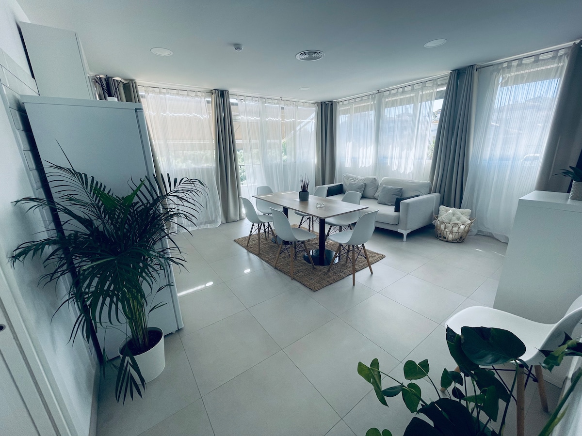 Atraskite Alikantę stilingai šiame elegantiškame 1 miegamojo bute Gran Vía rajone (netoli ligoninės). Idealiai tinka 4 (šeimoms ar darbui), jame yra atskiras miegamasis, svetainė su sofa-lova ir prieiga prie bendro baseino. Atsipalaiduokite dizainerių sukurtoje erdvėje su oro kondicionieriumi, sparčiuoju belaidžiu internetu ir visais patogumais. Bute netrukus bus virtuvė. Puiki vieta patogiai ir stilingai viešnagei, užtikrinant Palm Suites kokybę.