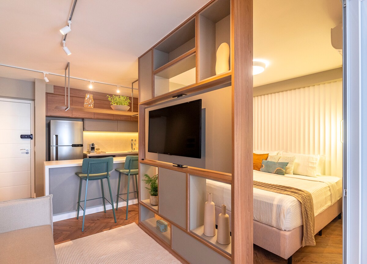 Patirkite komfortą ir praktiškumą! Paruošėme modernų butą, įrengtą su didele meile jūsų viešnagei. Jausitės kaip namuose! Jauki atmosfera su: Pilnai įrengta virtuvė, saulėtas balkonas, dvigulė lova su spinta, išmanusis televizorius, Wi-Fi, oro kondicionierius ir nauja bei minkšta patalynė ir vonios rankšluosčiai! Ir dar daugiau: be žavingos ir laisvalaikio studijos kondominiume, būsite privilegijuotoje vietoje, netoli Bosque dos Jequitibás, Av. Šiaurės-Pietų ir Cambuí, su puikiais restoranais ir kavinėmis.