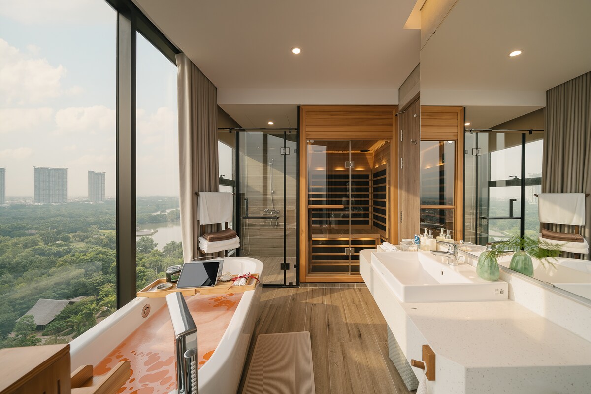 Ẩn mình giữa không gian xanh mát của Ecopark, căn hộ 3 phòng ngủ cao cấp này mang đến trải nghiệm nghỉ dưỡng đúng nghĩa, chỉ cách trung tâm Hà Nội khoảng 15km.Từ ban công và phòng ngủ, bạn có thể ngắm trọn Hồ Thiên Nga, sân golf, vườn Nhật và hoàng hôn dịu nhẹ mỗi chiều.Căn hộ được thiết kế theo phong cách hiện đại – ấm cúng, phù hợp cho gia đình, nhóm bạn hoặc khách lưu trú dài ngày. Điểm nhấn đặc biệt là bồn tắm nước nóng & phòng xông hơi khô riêng tư, cảm giác thư giãn như tại resort.