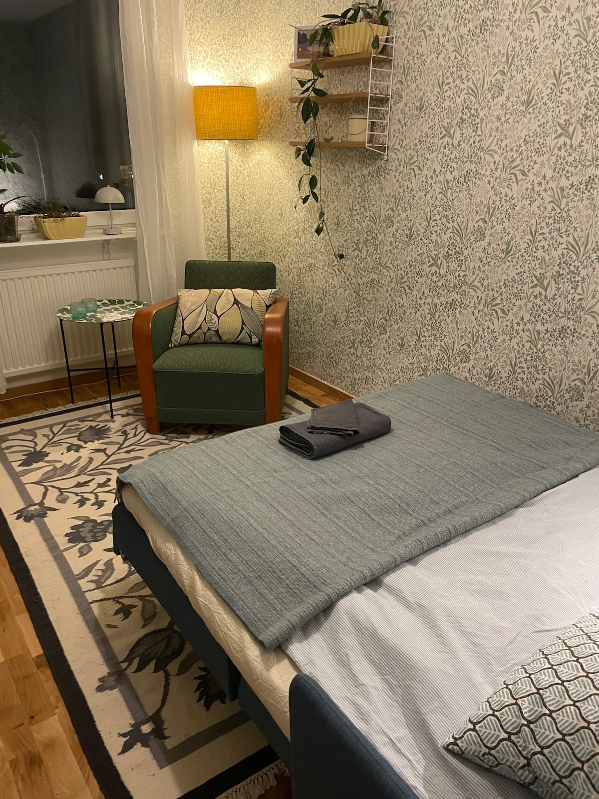 Apstatytas 20 m2 vieno miegamojo butas su vaizdu į Växjösjön ir tik 5 minutės pėsčiomis iki Centrum ir stoties. Važiavimas dviračiu iki universiteto trunka ne ilgiau kaip 10 minučių, o iki ligoninės kitoje ežero pusėje - tik 5 minutes. Butas yra šviesus su parketo grindimis, su pilnai įrengta virtuvėle, privačiu tualetu ir dušu tiesiai šalia buto. Prieiga prie sodo pietvakariuose su gražiais vaizdais/vakaro saule virš Växjösjön. Galite greitai ir lengvai nusileisti prie ežero pasivaikščioti, paplaukioti ar apsilankyti restorane.