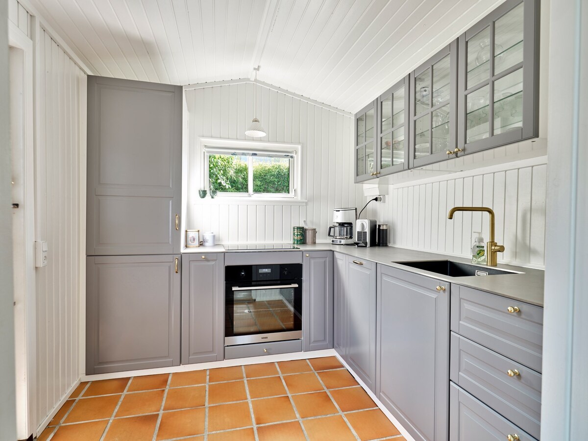 Nuostabus vasarnamis su nuostabiais vaizdais į fjordą. Dengta terasa, svetainė su integruota virtuve, du miegamieji (vienas su vaizdu) Mažas vonios kambarys. Svečių namas su lova 1,40m. 250,00 už naktį nuomojamas tik visai viešnagei. Lauko sūkurinė vonia, nuomojama 400,00Kr per dieną, tik visai viešnagei. Pirtis ir garinė pirtis, monetomis valdomas aparatas, mokamas 10.-Kr/10 min. Leidžiama apsistoti su šunimis: 100 kr/ šuniui ir dienai - Dviračiai, Wi-Fi, dujinė kepsninė, patalynė, nemokamas naudojimas