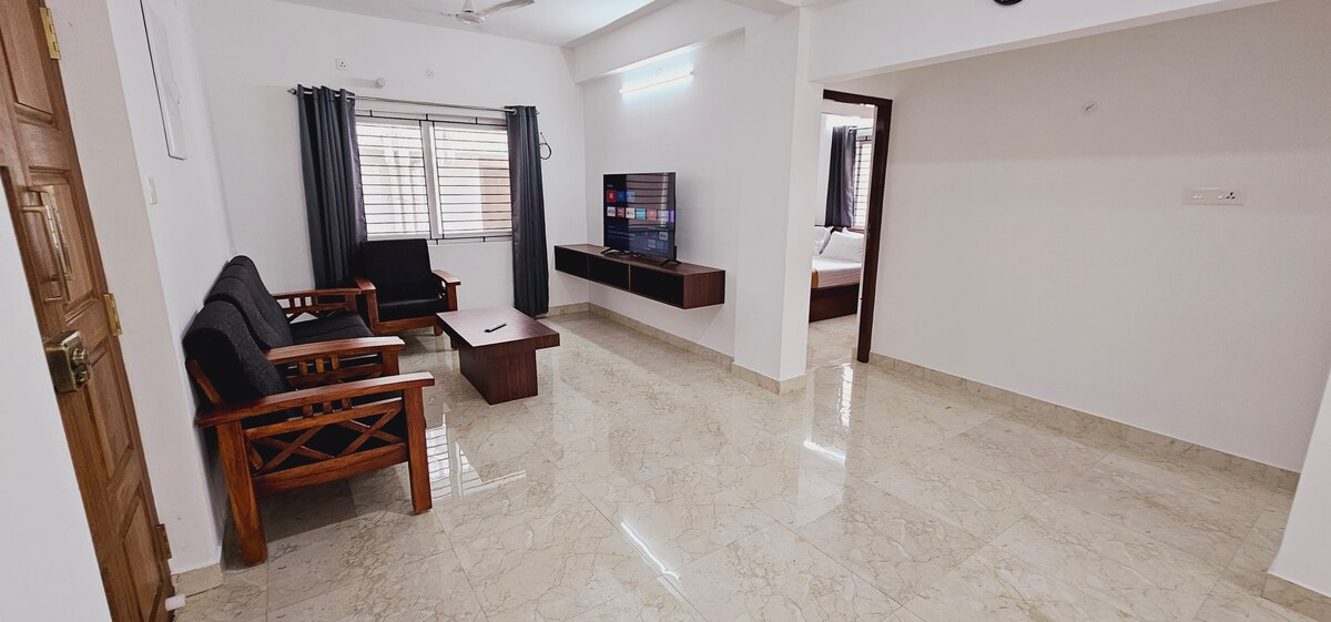 - 2 Bedrooms with wardrobes & attached bathrooms - A/C in living room & 2 bedrooms - High-speed WiFi & Smart TV - Gas Stove for Cooking - Modular Kitchen with induction stove, microwave, fridge, kettle & essentials - Relaxing wooden swing in the living room - Alternate-day cleaning - Washing Machine for your laundry needs - On-call driver service - 2 mins walk to Velachery 100 ft Road - 10 mins walk to Phoenix Market City - 10 mins walk to IIT Chennai (Velachery Gate) & Gurunanak College