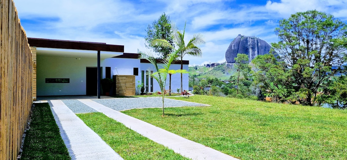 * Ežero lygiai grįžo, o dokai plūduriuoja! * Patirkite įspūdingą „Arc House“ - architektūrinio dizaino perlą privačioje įlankoje, vos už 10 min. kelio nuo Gvatape. Stiklinės sienos, 20 pėdų lubos ir panoraminiai gamtos vaizdai paverčia jį išties unikaliu. Namuose yra 2 dviviečiai miegamieji, atskiri vonios kambariai, balkonai ir sofa gyvenamojoje erdvėje, kurioje gali apsistoti iš viso 6 žmonės. Aukštos kokybės virtuvė yra šefo svajonė, kurią papildo valgomasis stalas 6 asmenims ir balkonas su vaizdu į ežerą.