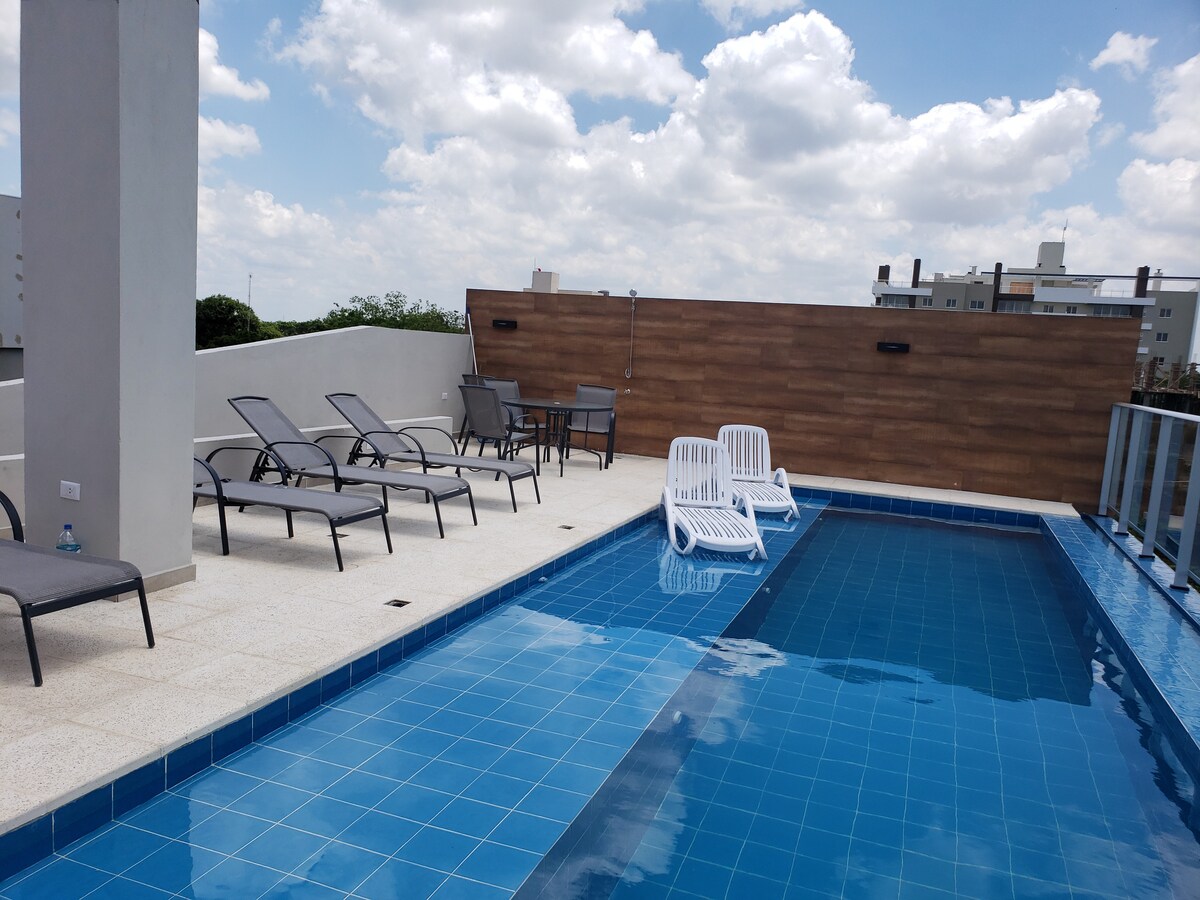 Mėgaukitės moderniu butu, labai patogiu ir gerai sujungtu 1, 2 ar 3 asmenims, kelios minutės nuo tarptautinio oro uosto. Visą parą veikiantis prekybos centras už 1 kvartalo, netoliese yra vaistinė ir restoranai. Netoli Ñu Guasu parko, olimpinio komiteto, Conmebol ir CIT. Greita prieiga prie įmonės ašies, Shopping del Sol ir La Galería. Įrengtas oro kondicionierius, belaidis internetas, darbo stalas, televizorius, virtuvė ir privatus kiemelis su hamaku. Pervežimo paslaugos ir pusryčiai. Puikiai tinka poroms ar persėdant į kitą lėktuvą.