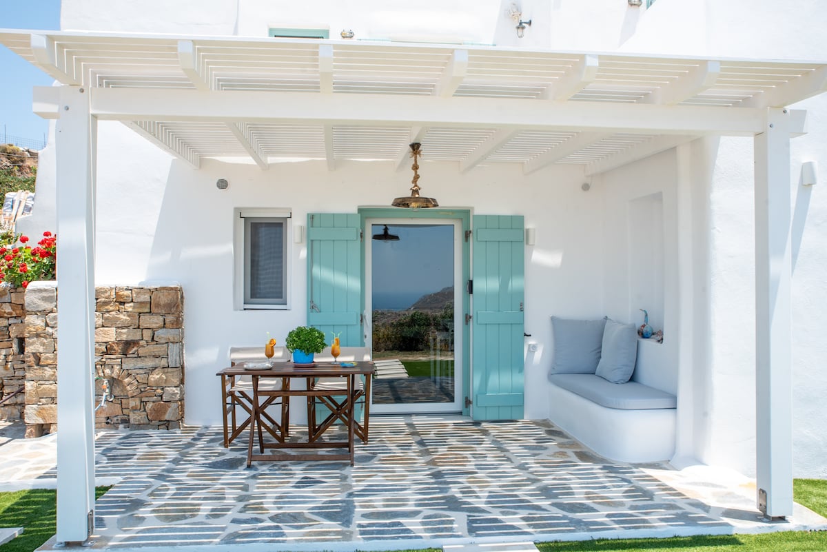 Open the sea-blue shutters and let in the cooling breeze, then whip up a snack at the urban concrete kitchen countertop at a breezy waterfront retreat. Step onto the spacious, leafy veranda for leisurely sunset drinks with unobstructed ocean views! The apartment is situated next to a sandy beach for a morning swim and a 2-minute walk from the center of Naousa and its main square. Shops, restaurants, bars, and clubs are within walking distance, yet the area is very quiet and calm!