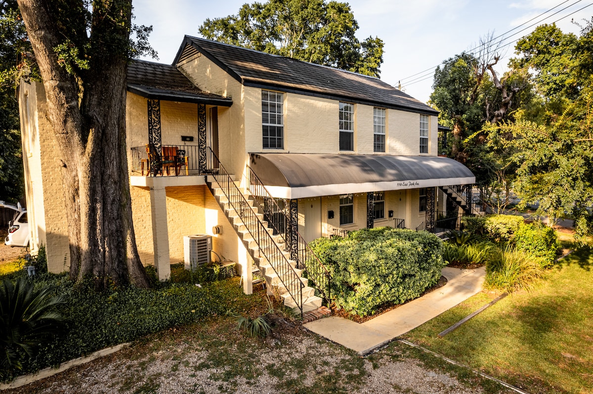 "Private Entrance" 2nd-story STUDIO w/lots of windows. Wood floors, central AC/heat, 1/2 bath, queen bed with new mattress, fridge, Krueig, microwave, WIFI, TV, closet space, ROBES FOR PRIVATE OUTDOOR WATER-HEATED SHOWER and towels. Established neighborhood less than 2 miles from FSU and downtown; 1 block to Tallahassee Memorial Hospital. Restaurants under 1/2 mile! It is on our property and we personally clean the studio. Go Noles!