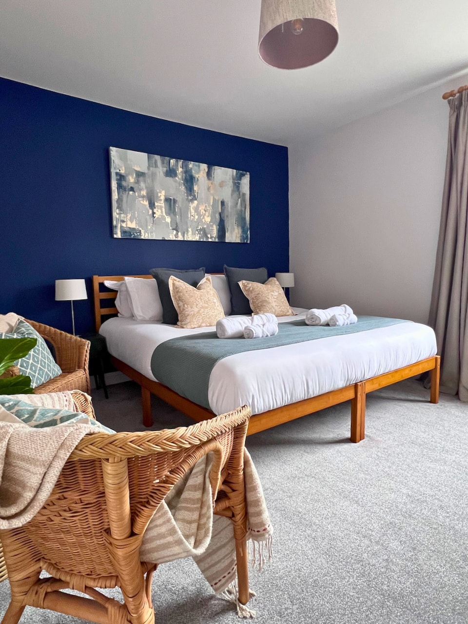 Bright, self-contained annexe on the 1st floor with private entry and lockbox for easy check-in. Features a king-size bed, sofa bed, dining area, and kitchenette with fridge/freezer, toaster, and tea/coffee facilities (no hob/oven). Mezzanine with two single beds, accessed by stepladder with lockable gate. Modern ensuite with shower and fresh towels. 42” TV with Netflix (no terrestrial TV). Private parking for 2–3 cars. EV charger available on request for a fee.