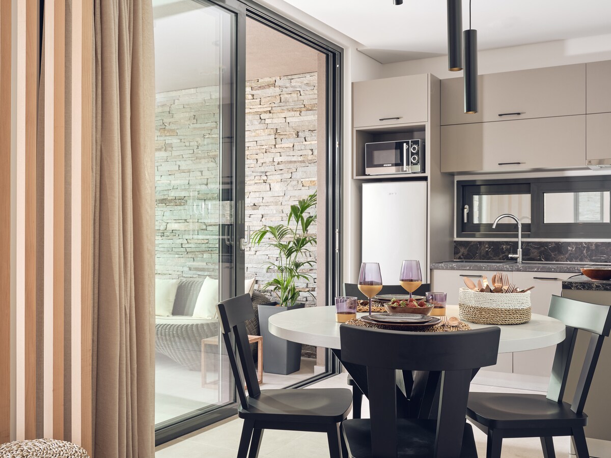 (IG: theros_residences) Théros Exotica įkūnija lytingą ramybę - ten, kur susitinka sluoksniuotos tekstūros, minkšta šviesa ir atogrąžų ramybė. Įsikūręs ant kalvos virš Tsilivi, jis atsiveria į tolimą Kefalonijos pakrantę ir auksinius saulėlydžius. Privatus baseinas, kuruojamas paprastumas ir sklandus vidaus ir lauko srautas, kviečia ramią prabangą. Kad būtų lengviau ir elegantiška, suplanuotas maršrutinis autobusas sujungia jus su Zakinto miestu, nors galbūt niekada nenorėsite išvykti. Apsupta vešlių palmių ir švelnių vėjų, kiekviena detalė kalba apie ramybę.