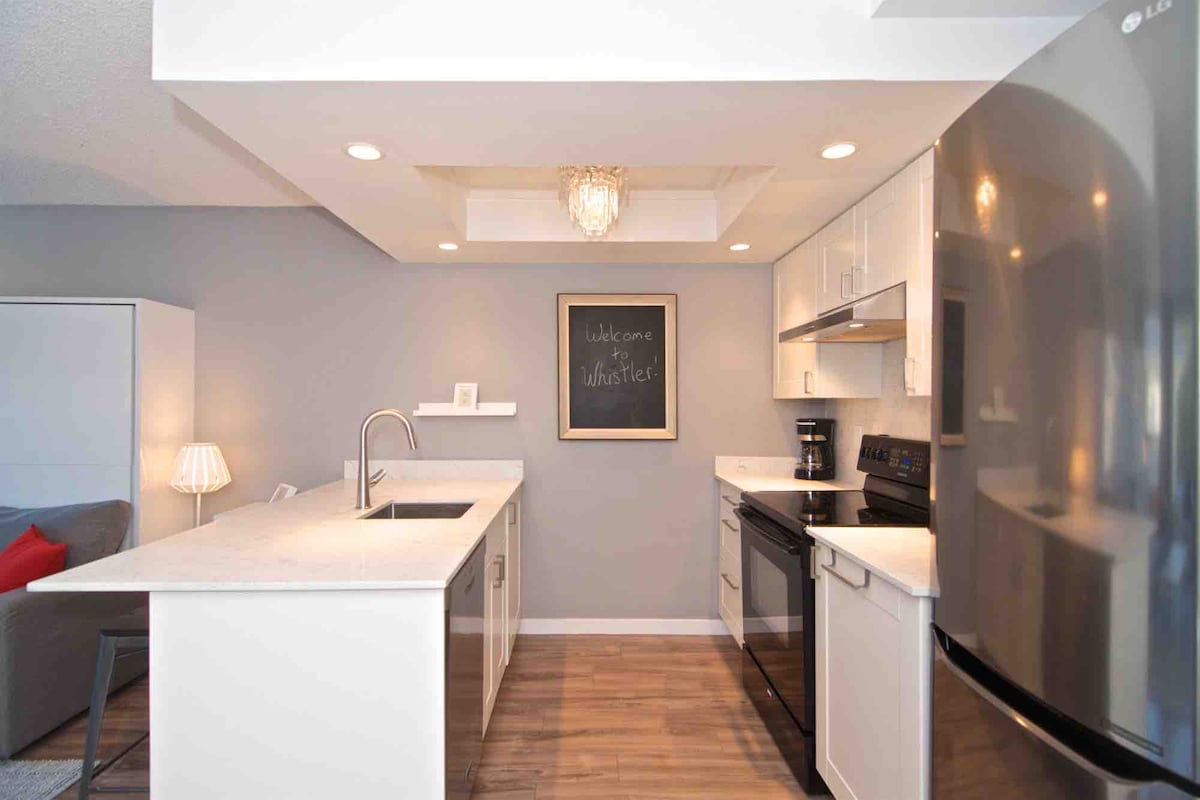 Sveiki atvykę į kalnų oazę. 1 min pėsčiomis nuo Blackcomb lifto! Mūsų modernus butas yra šviesus, erdvus 1 miegamojo butas su per visą butą einančiais langais, pro kuriuos atsiveria puikūs vaizdai į medžiais apsuptą gatvę ir kalnus. Gurkšnodami kavą prie virtuvės stalo žvelkite tiesiai į Vislerio kalną! Apartamentuose yra viskas: - dvigulė lova - sofa-lova - Pilnai įrengta virtuvė su nauja indaplove - sūkurinė vonia - Keurig - Bose garsiakalbis - centrinė oro kondicionierius - atnaujinta 2025 m. liepą Pastate yra sporto salė, skalbykla, baseinas ir lauko sūkurinė vonia.