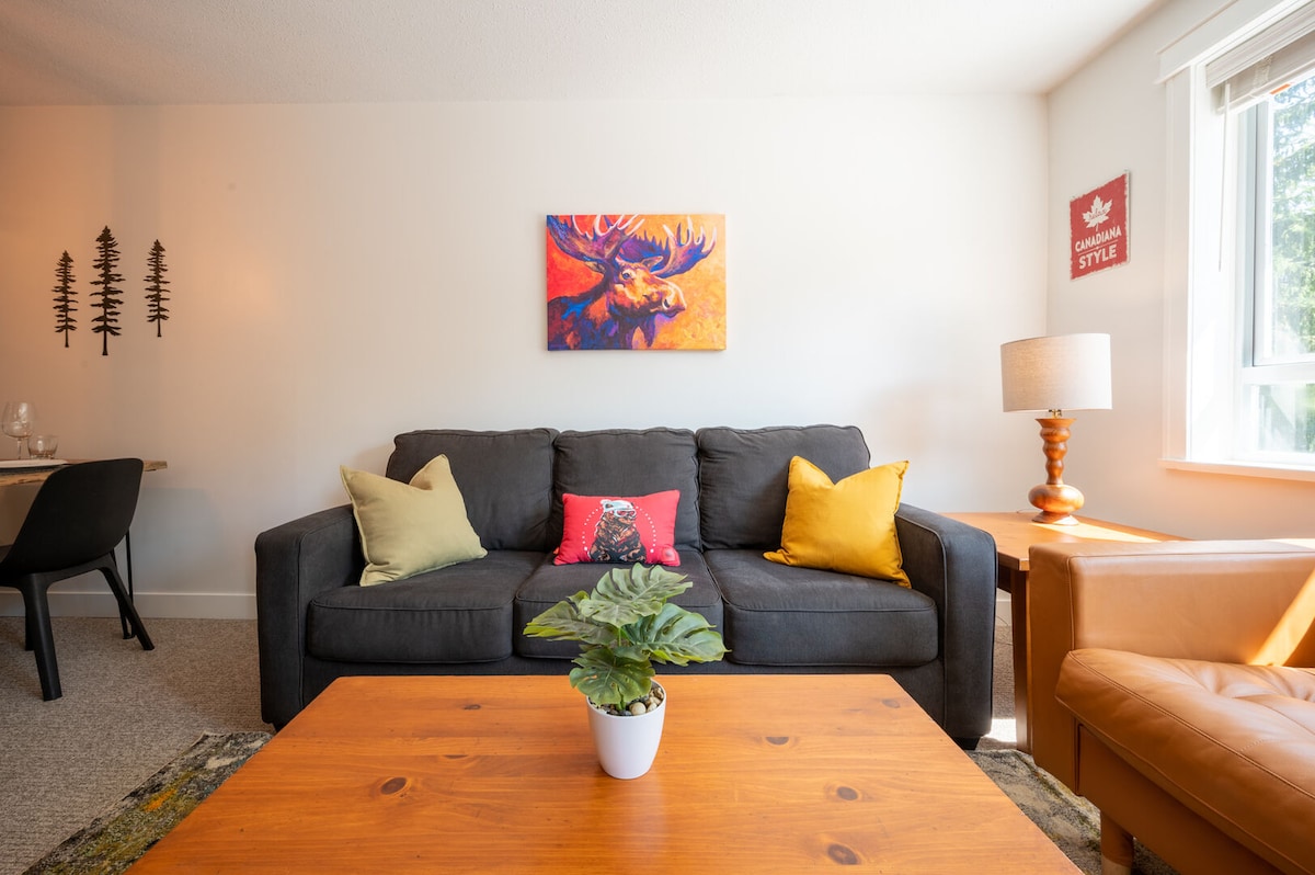Sveiki atvykę į kalnų oazę. 1 min pėsčiomis nuo Blackcomb lifto! Mūsų modernus kondominiumas yra šviesus, erdvus 1 miegamasis su apvyniotais langais, iš kurių atsiveria puikus vaizdas į medžiais ir kalnus. Pažvelkite tiesiai į Whistler kalną gurkšnodami kavą nuo virtuvės stalo! Apartamentuose yra viskas: - dvigulė lova - sofa-lova - pilna virtuvė - sūkurinė vonia - Keurig - Bose garsiakalbis - centrinė oro kondicionierius - atnaujinta 2025 m. liepą Pastate yra sporto salė, skalbykla, baseinas ir lauko sūkurinė vonia.