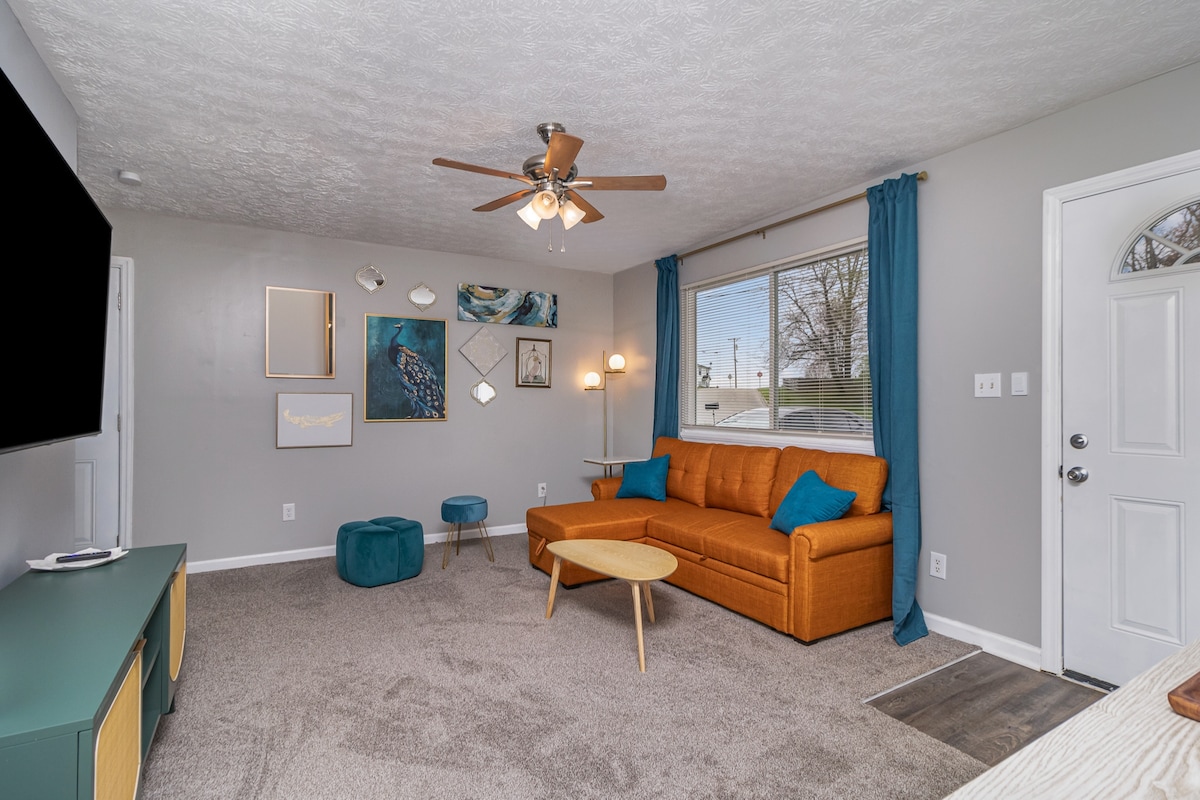 Tik 1 mylia nuo arkos! Mūsų „Southern Belle“ puikiai tinka šeimos poilsiui su visais namų patogumais. Įsikūręs tarp Sinsinatio ir Leksingtono, tai ideali vieta suplanuoti dienos kelionę bet kuria kryptimi. Visas NAUJAS interjeras, 1 aukštas, 1 vonia, 2 miegamieji su karališko dydžio lovomis, ištraukiama sofa 5-ajam svečiui. Patalynė pateikta! Nėra skalbyklės ir džiovyklės Įrengta virtuvė, gyvenamasis namas su išmaniuoju televizoriumi ir terasa su DUJINE laužaviete. NEMOKAMAS belaidis ryšys, kabelinė televizija ir pakankamai kavos su visais tvirtinimais 1 puodui per dieną.