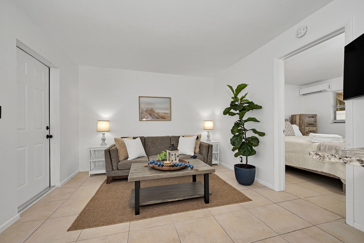 1 BedApartment suite su erdvia svetaine, valgomuoju ir virtuvėle (su pilno dydžio šaldytuvu, įprasta stalviršine orkaite ir kaitlente, puodais ir keptuvėmis, indais, stiklinėmis ir valgymo reikmenimis). Ir pilna vonia su skalbykle ir džiovykle. Bute yra atskiras įėjimas, SŪKURINĖ VONIA su sūkurine vonia ir anglies kepsnine bei dujinė kepsninė Netoli Winton Drive, barų ir restoranų, vos už kelių kvartalų nuo parduotuvių, už 3 mylių nuo paplūdimio ir už 15 minučių nuo FLL oro uosto.