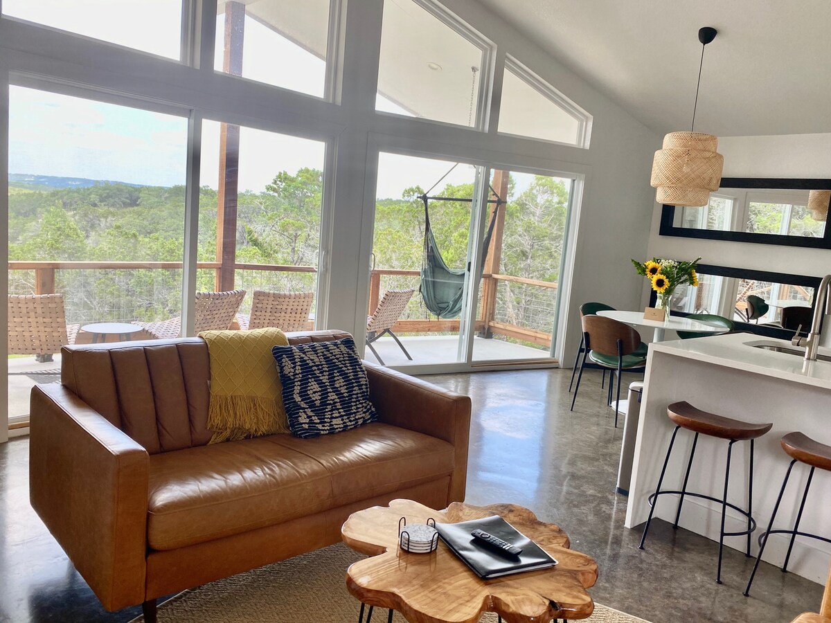 Planuokite atsipalaiduoti ir atgauti jėgas apsistojant Northstar Modern Cabin - mūsų prabangaus apgyvendinimo variante. Įsivaizduokite, kad priekinėje verandoje gurkšnokite ką tik paruoštą kavą, žavėdamiesi neįtikėtinu, plačiu vaizdu į Hill Country. Nors kai kurie žmonės čia apsistoja, kad pabėgtų nuo visko, tai tik penkių minučių kelio automobiliu palei Blanko upę iki parduotuvių, restoranų ir pramogų. Kai grįšite vakarui, atsipalaiduokite ir pasimėgaukite saulėlydžiu bei žvaigždžių stebėjimu.