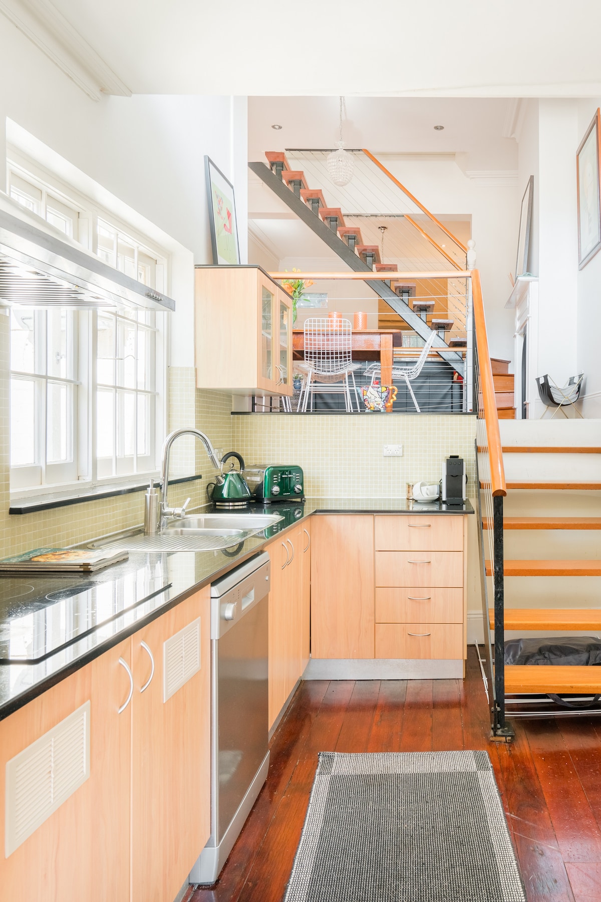 Pabėkite į mūsų erdvų, stilingo dizaino prieglobstį, kuriame yra dvi jaukios svetainės ir oro kondicionierius pagrindiniame aukšte bei du miegamieji. Sofa-lova yra antrame poilsio kambaryje. Kaip ir visi terasos namai Sidnėjuje, tarp trijų lygių reikia daug laiptų. Jei laukiate to klubo pakeitimo, ši vieta gali būti ne jums. Pilnai įrengta virtuvė su orkaite, virykle, kavos ankštimis ir visais norimais įrankiais. Jei tai skrudinta duona ar kepsnys, galite jį gaminti čia!