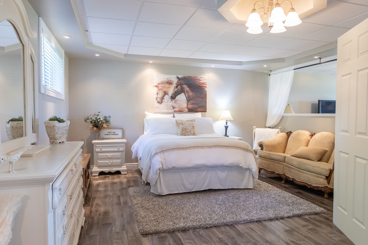 Luxurious 1-bedroom basement apartment just 4 minutes from downtown Napanee and 800m from the hospital. A short drive to Prince Edward County, famous for its breweries, wineries and Sandbanks Provincial Park. Enjoy a private entrance with a cozy patio and BBQ in a quiet setting. Inside, relax with radiant floor heating, an electric fireplace and a fully stocked upgraded kitchen. Bright, spacious and beautifully designed with modern rustic charm, this cozy retreat is perfect for your stay.