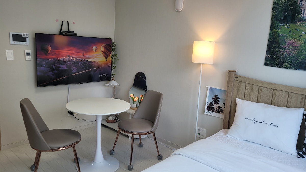 숙소 설명 ✅꼭 필독✅해 주시고 이용해 주세요!! ❤️"잠자리"라는 기본에 가장 충실하려고 "노력"한 공간입니다! ✅숙소 옵션✅ -삼성 스마트 TV -초고속 wifi지원 -삼성 시스템 에어컨 -삼성 스타일러 -드럼 세탁기 -일리머신기 -전기 포트기 ✅숙소 주방 옵셔✅ -인덕션 2구 -머그잔/맥주잔 -앞 접시 / 중 접시 -냄비 1개 -조리도구(국자,집개,칼,가위) -수저셋트 (2인 인준) 🙏저희 숙소는 간단한 조리 (라면정도) 가능 하세여 참고해 주세여! 후라이팬x ✅화장실/샤워실 옵션✅ -핸드워시 -칫솔, 치약 -폼클랜징 , 클랜징 오일 -샴프/컨디셔너/바디워시 -바디로션 -화장솜 , 면봉 -헤어드라이기, 고데기