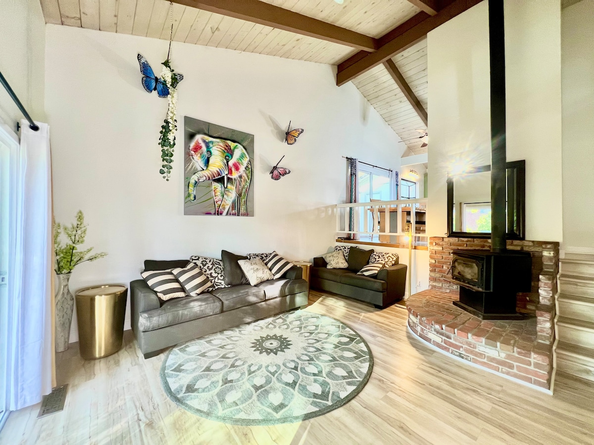 Soulful home in the Sierra Foothills, 2 hours from the Bay Area, with the warmth of a real home and not a business. Nestled on fenced 5 acres, this home is the perfect gathering retreat for privacy and relaxation. Take a soak in the hot tub with lake views, watch a movie by the fireplace, prepare exquisite meals in the gourmet kitchen and refine your mixology in the full-scale wet bar. Go paddle boarding on the lake, biking or play ping-pong, pickleball or badminton.